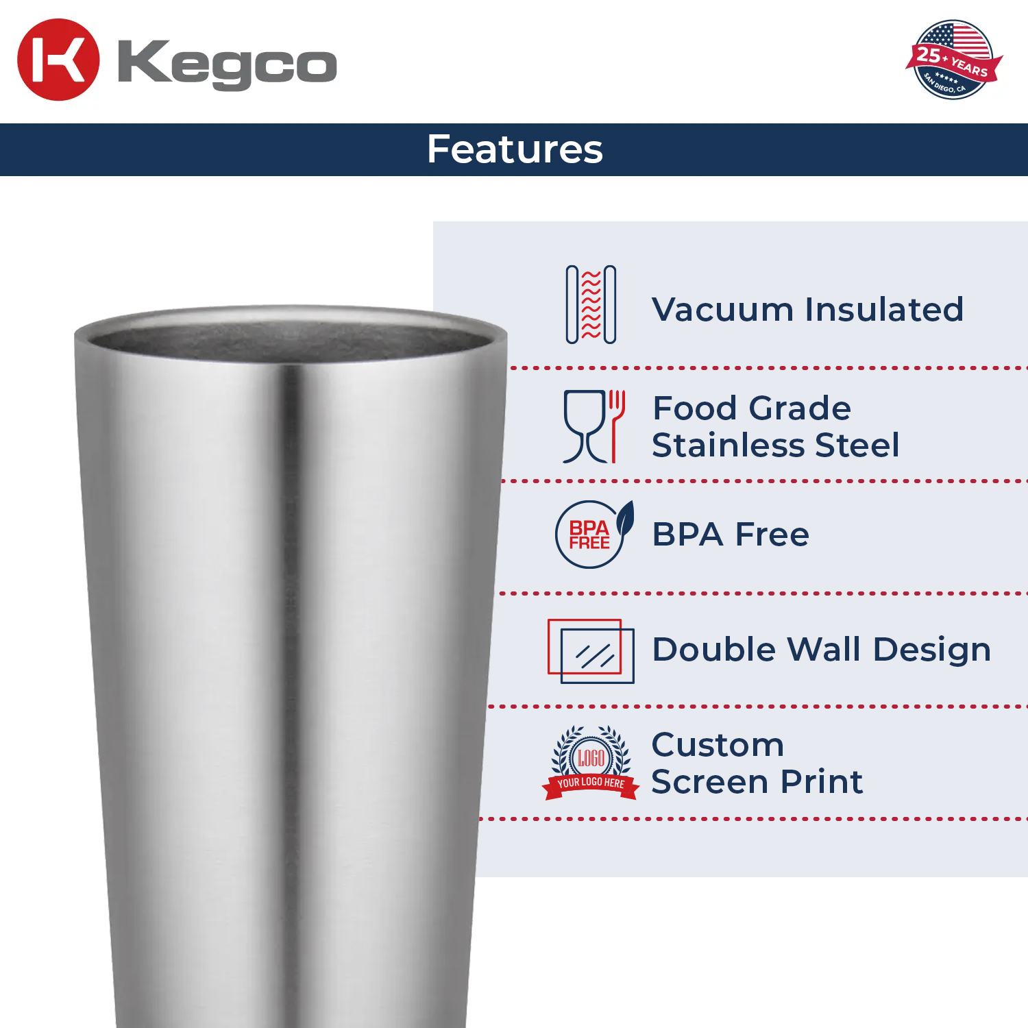 - Kegco's 16 oz. Stainless Steel Vacuum Insulated Beer Cups are made of premium quality food grade stainless steel