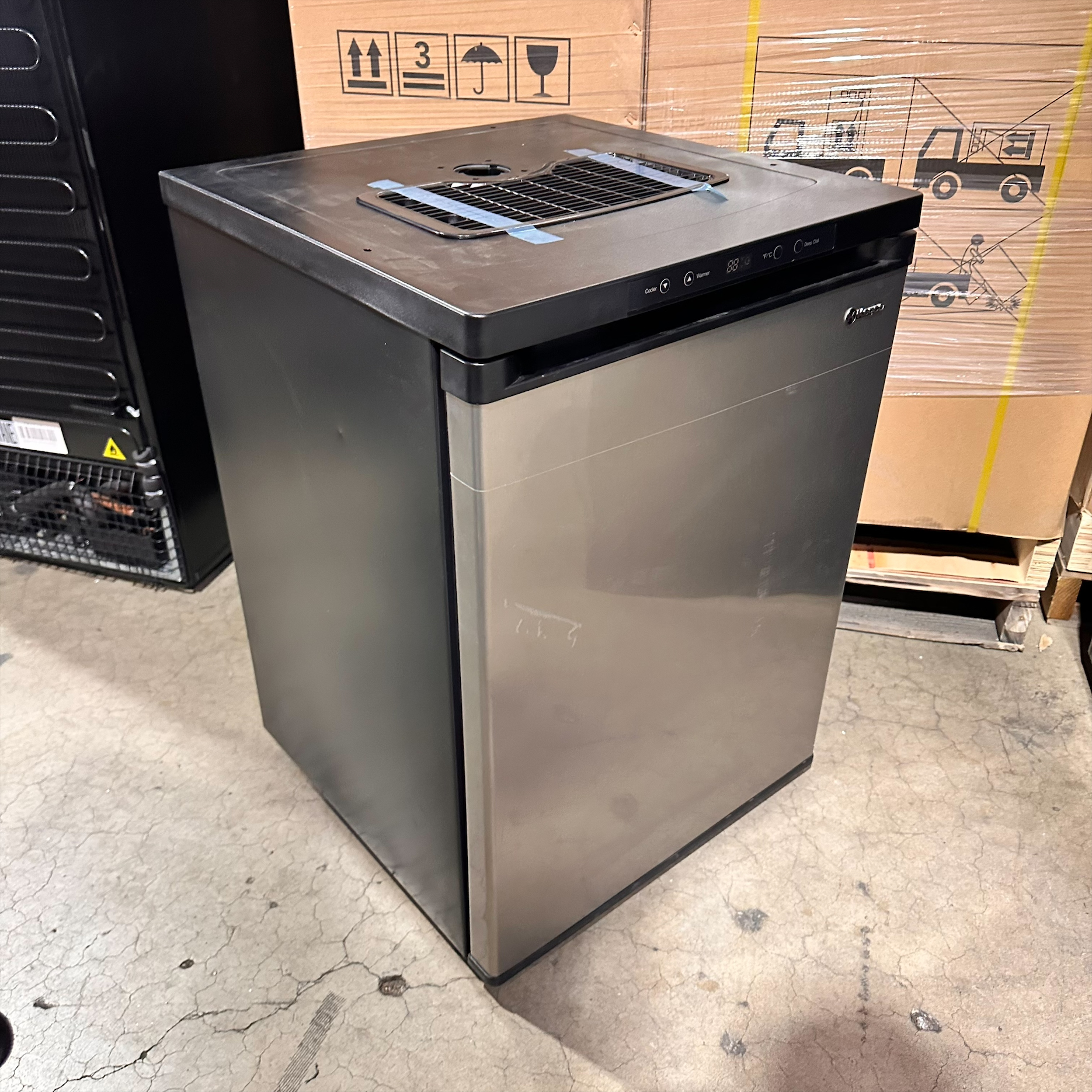 This unit was inspected to ensure it includes all the standard parts and manual. It is in good physical condition with the exception of a small dent on the left side. (See Final Photos). Damage does not affect the performance of the unit. Kegerator has been tested to ensure that it is in good working condition with a temperature that was verified down to 33°F on the lowest setting.