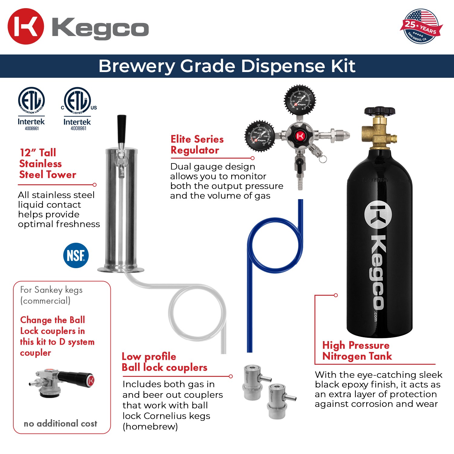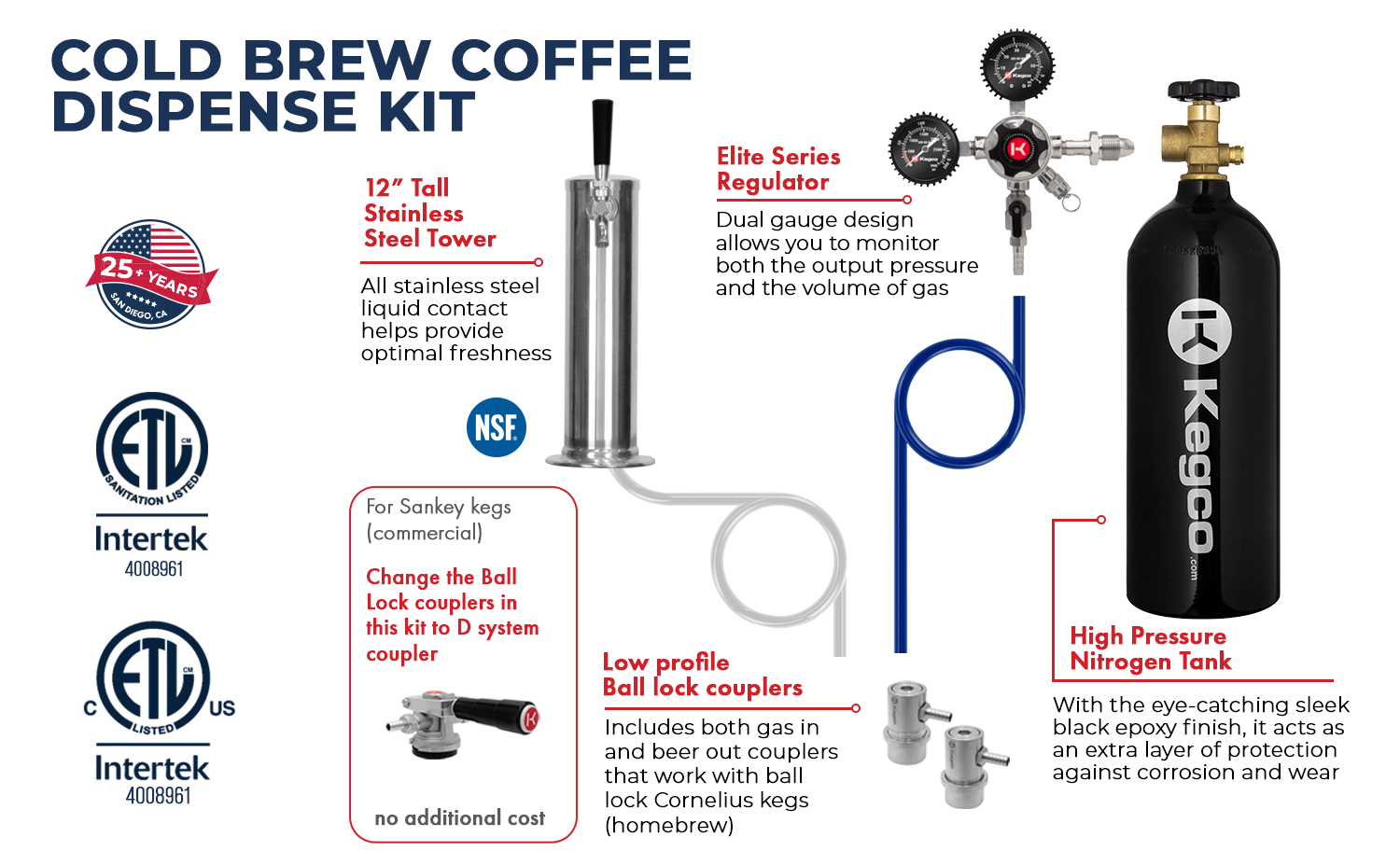 Designed for the unique requirements of dispensing iced coffee on tap from a coffee keg. The cold brew configuration comes with ETL sanitation listed and NSF compliant parts to dispense from Cornelius home brew kegs so your beverage is fresh from keg to tap.