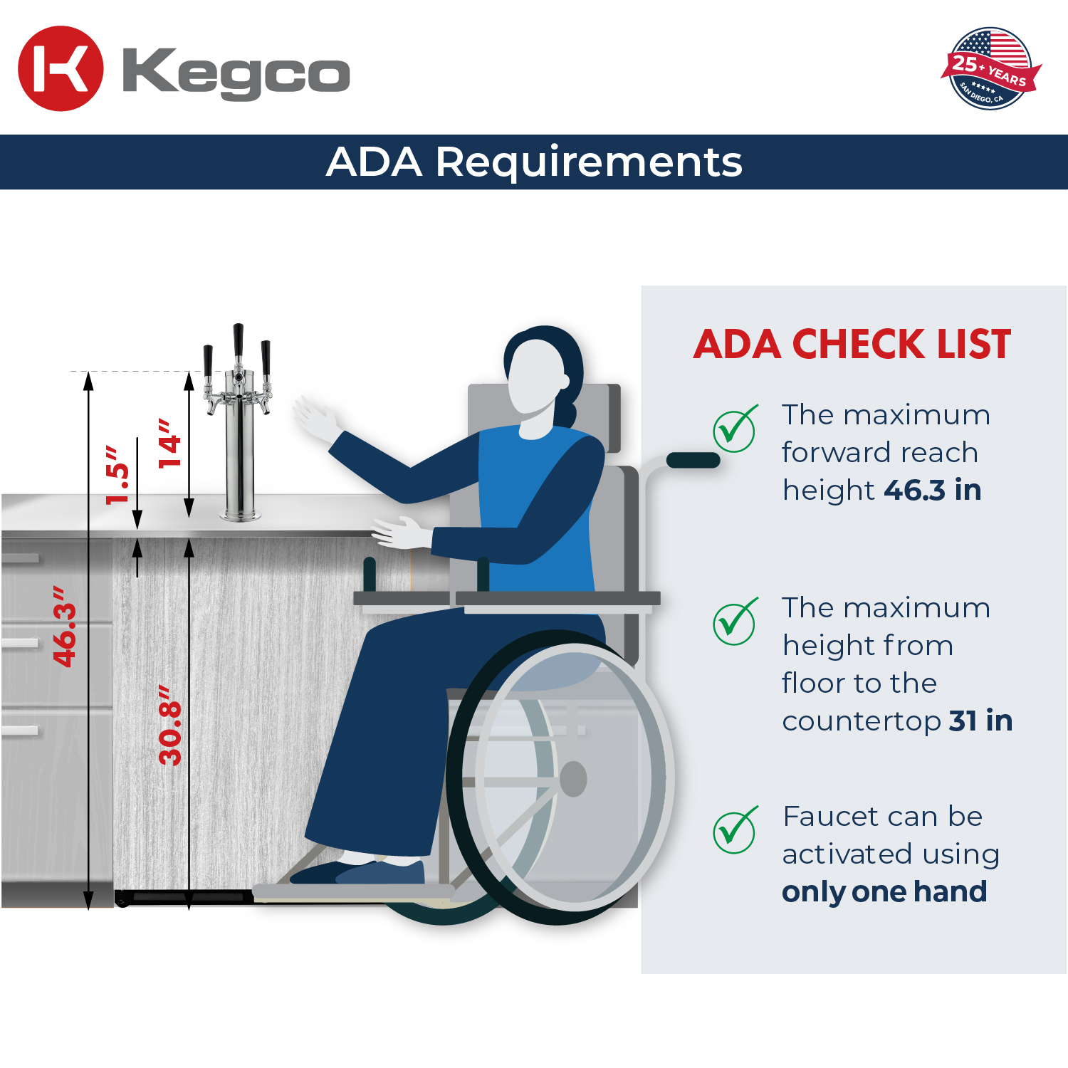 ADA-Compliant Height. At just 31 inch tall, this is the lowest ADA-compliant cold brew coffee kegerator available, designed for universal accessibility without sacrificing performance.