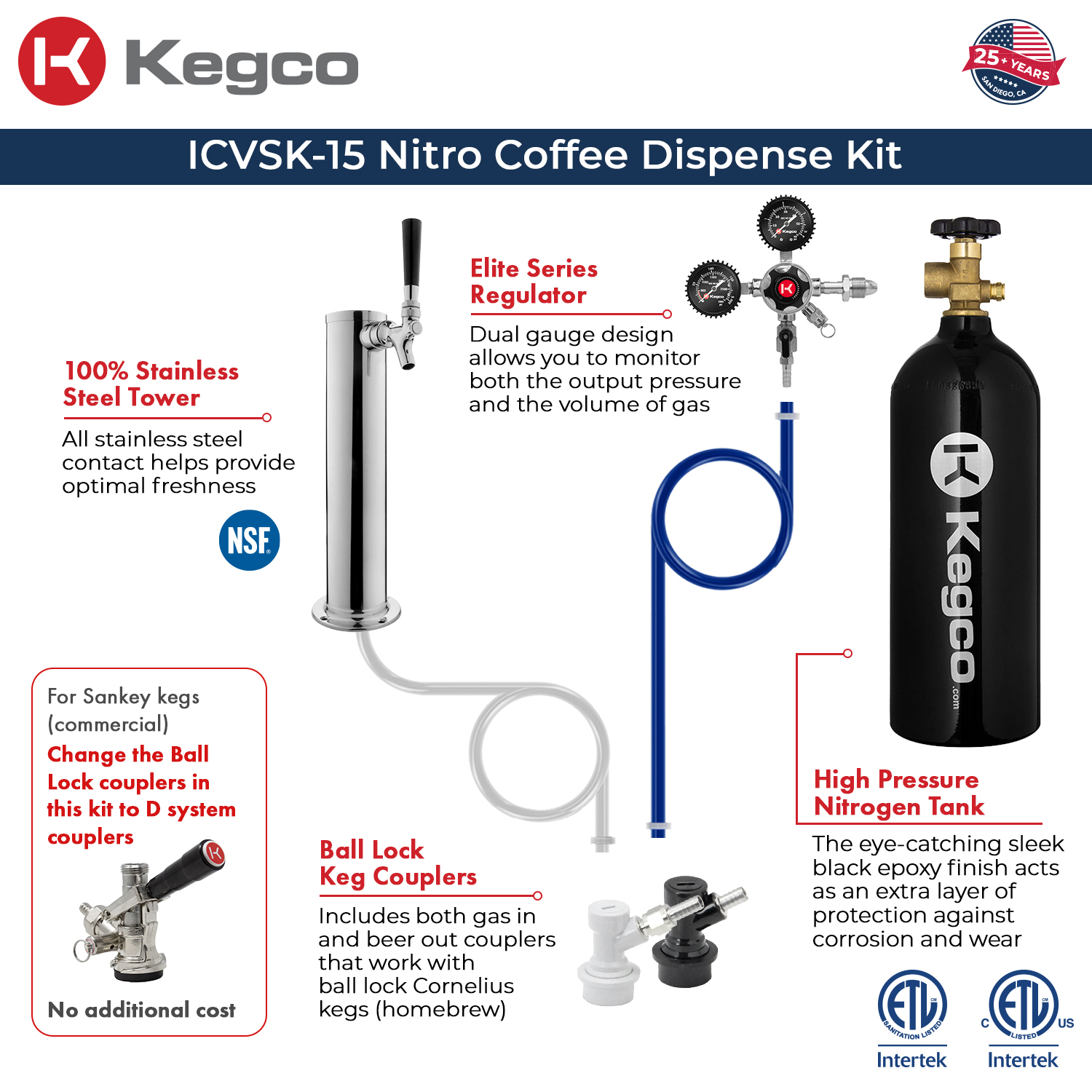 Designed for the unique requirements of dispensing iced coffee on tap from a coffee keg. The cold brew configuration comes with ETL sanitation listed and NSF compliant parts to dispense from Cornelius home brew kegs so your beverage is fresh from keg to tap.