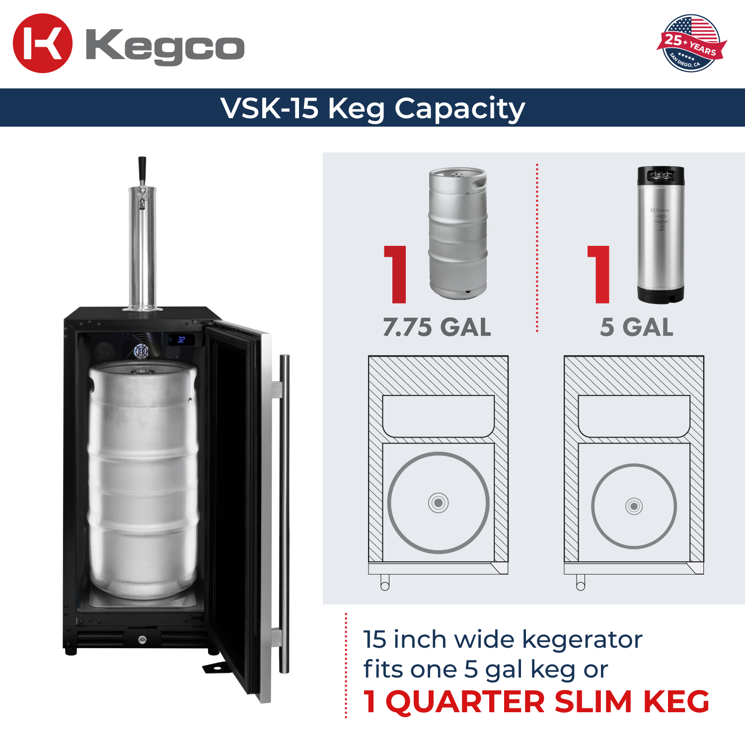 Compact design that is capable of accommodating 7.75 gallon quarter slim kegs as well as 5 gallon sankey or homebrew kegs