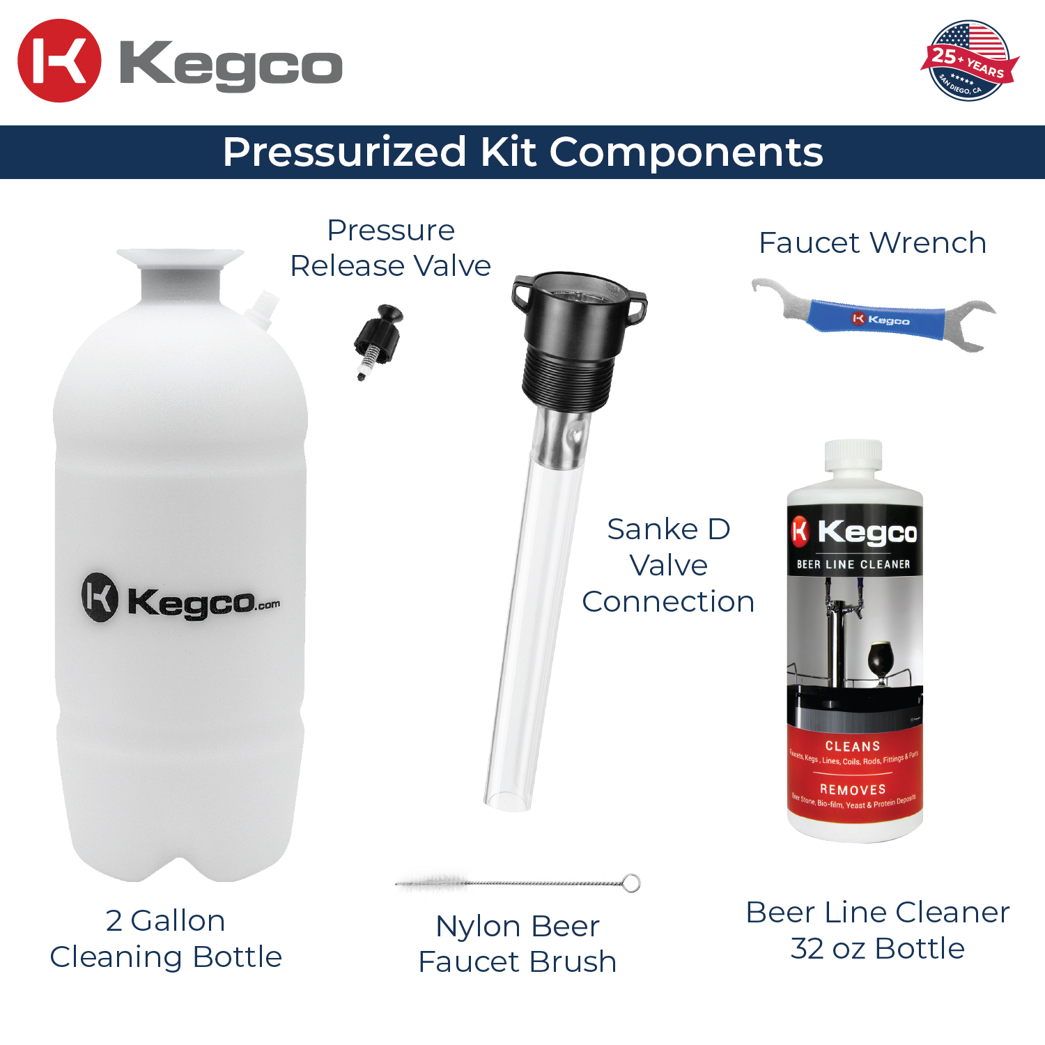 - Complete Cleaning Supply Pack. Comes with a full 32 oz. bottle of Kegco Beer Line Cleaner to keep your lines spotless longer.