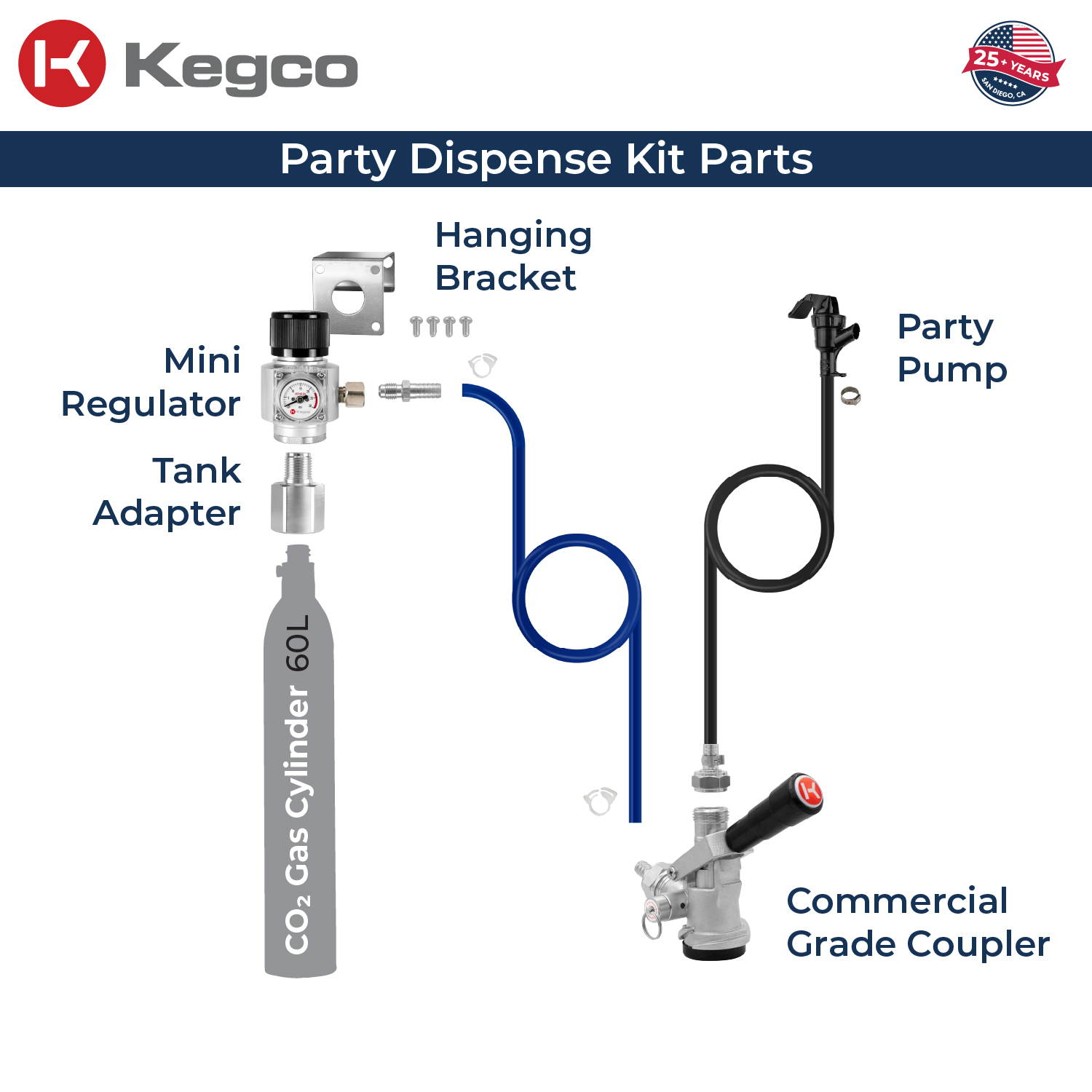 Turn any refrigerator into a personal kegerator with the Kegco CO2 Party Dispense Kit. Designed for convenience and mobility, this compact system lets you pour cold draft beer anytime, anywhere - no drilling, tools, or full-size CO2 tanks required. Featuring a mini regulator, D coupler, picnic faucet, and gas line, it connects easily to a SodaStream-style tank (sold separately) for a clean, efficient setup. Perfect for tailgates, backyard gatherings, or home entertaining, this kit brings the draft experience wherever the party goes.
