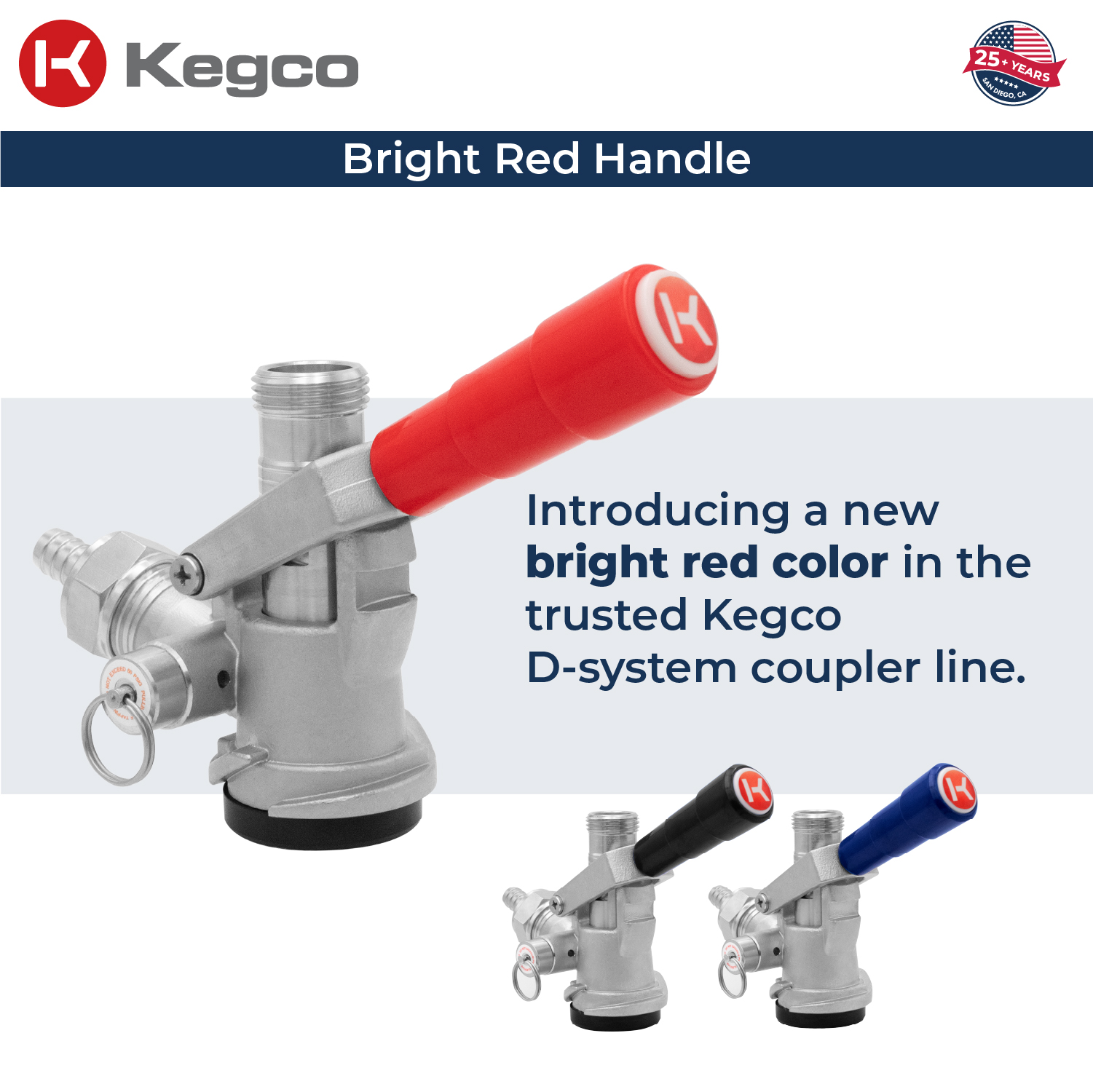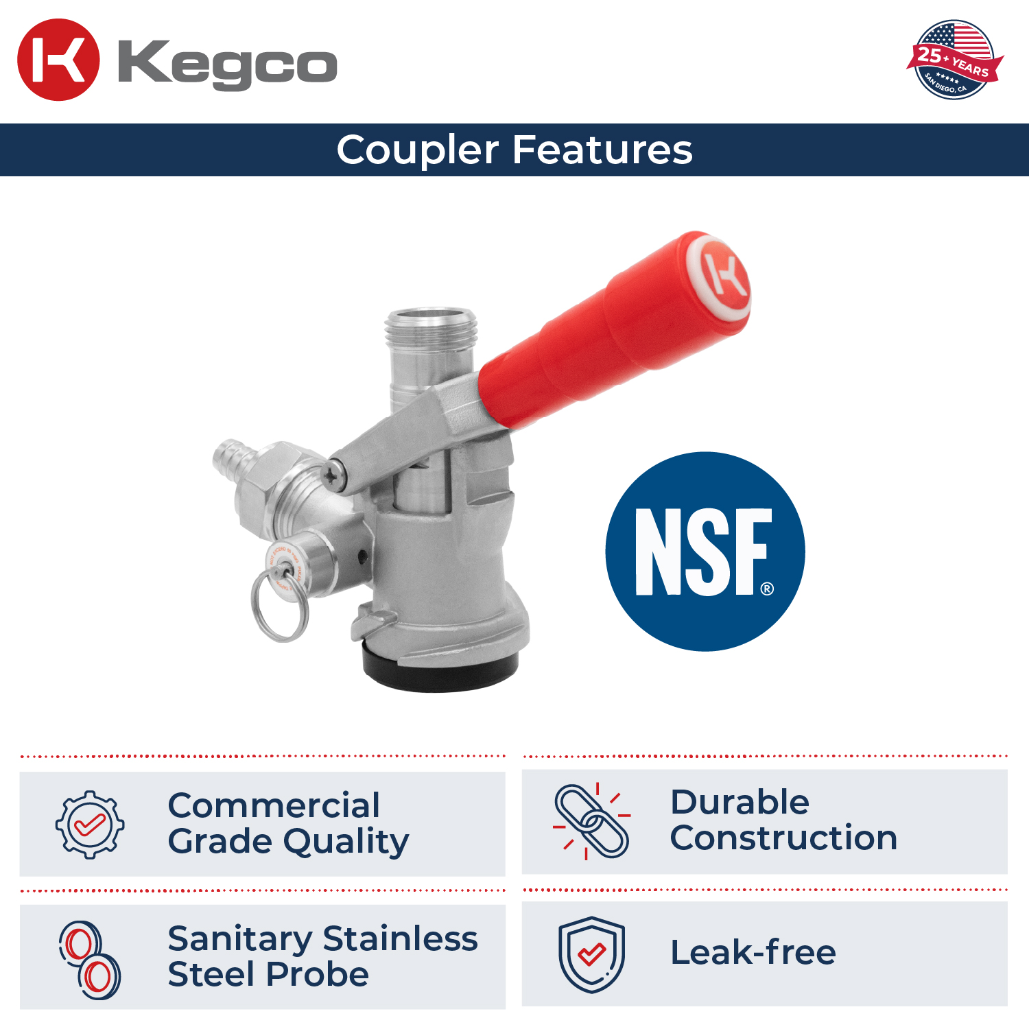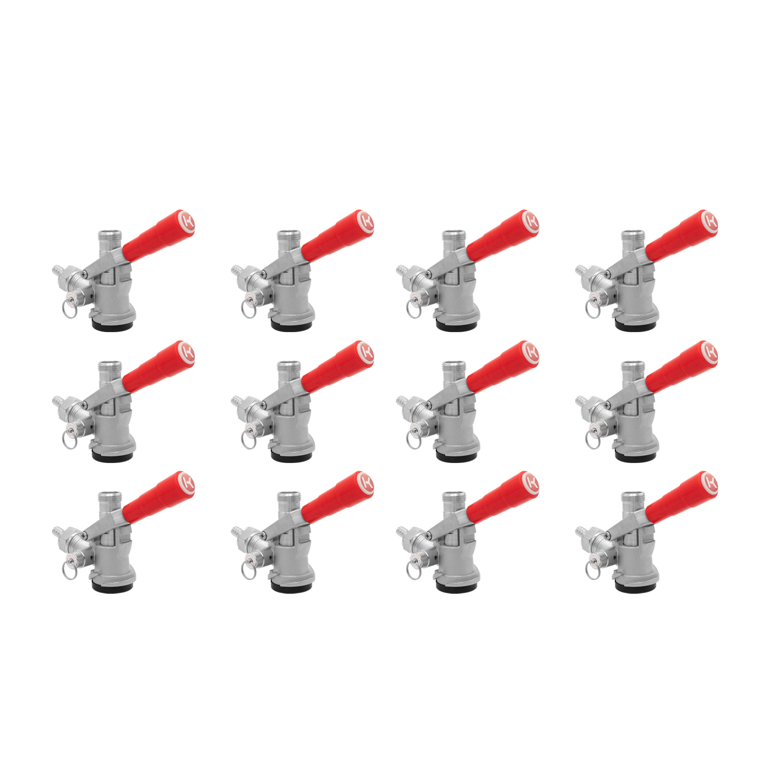 This set of twelve commercial grade Kegco HU-KT5DL-RD "D" System Lever Handle Keg Couplers is great for small breweries and tasting rooms. The HU-KT5DL-RD is compatible with all domestic brand kegs and works with any American "D" system sankey keg. These couplers feature a 55-psi pressure relief valve and a nickel-plated forged brass body with a stainless steel probe and red lever handle. To tap a keg, simply pull out and then down on the lever handle.