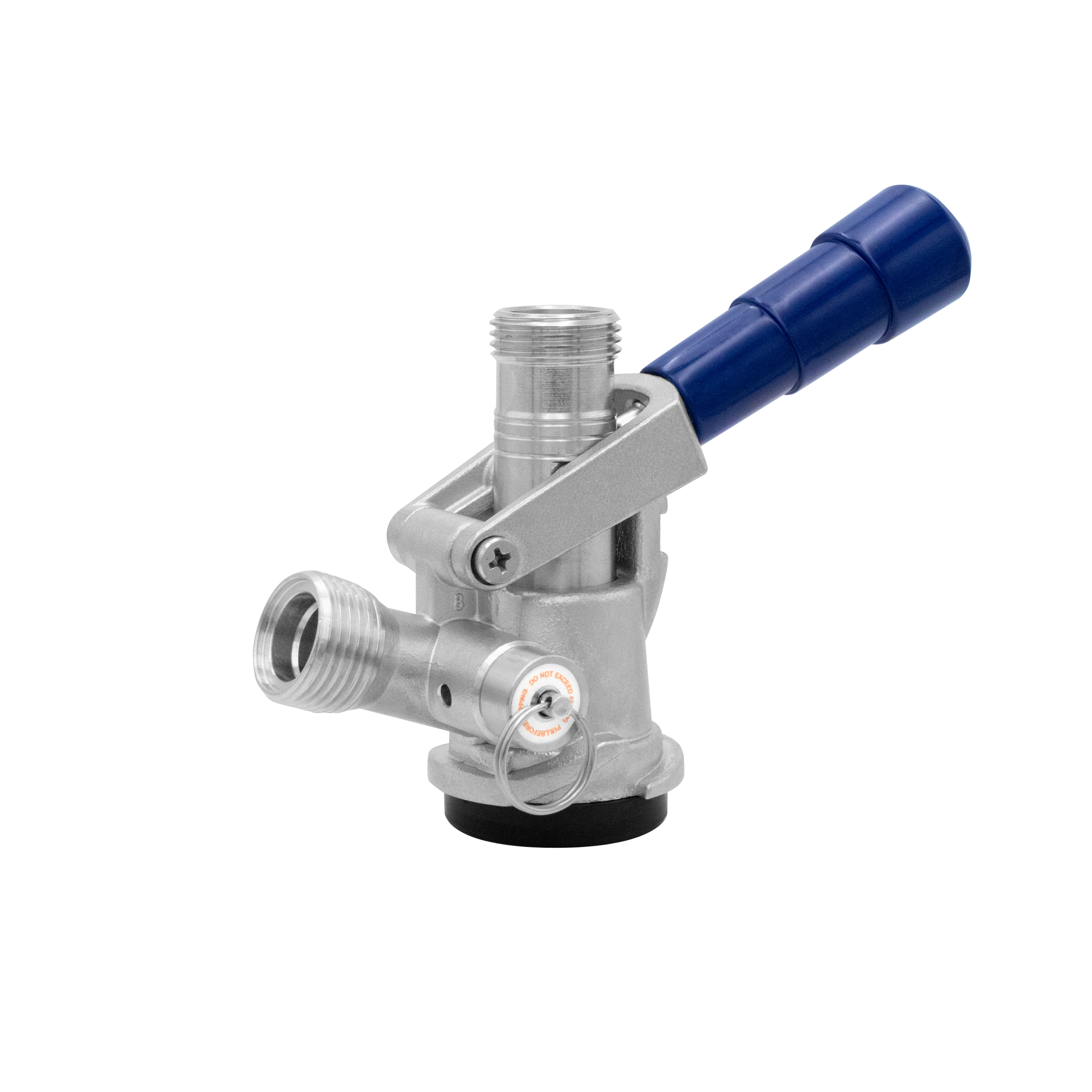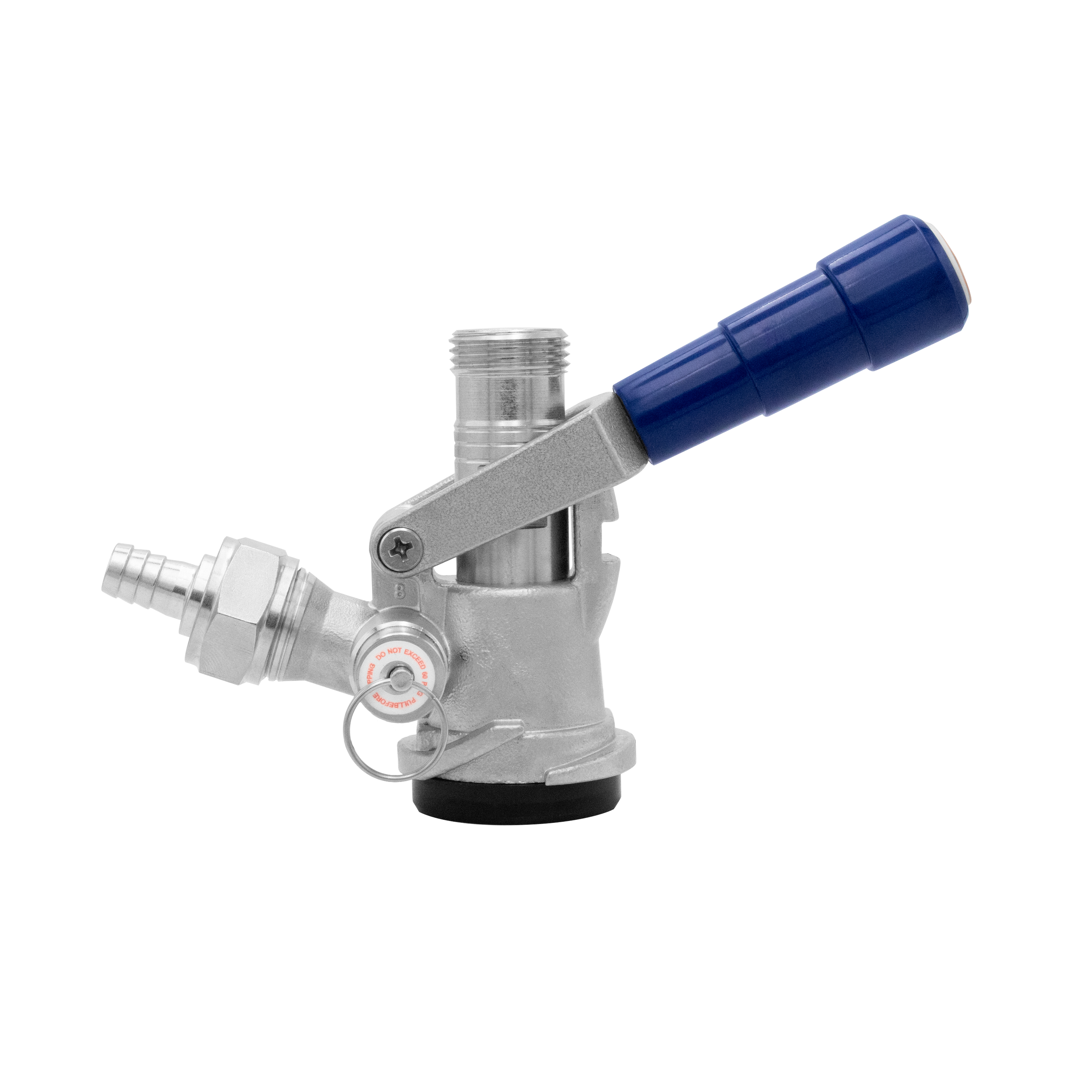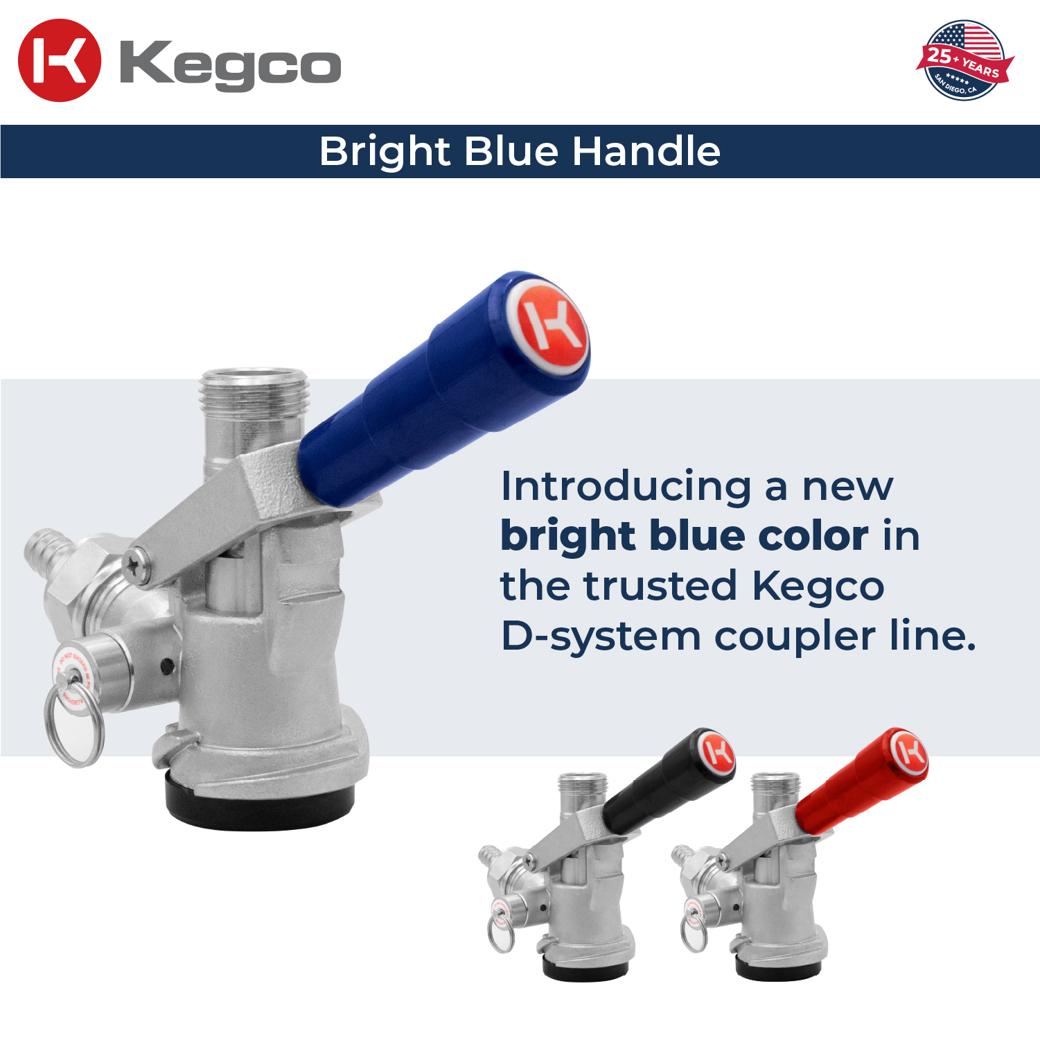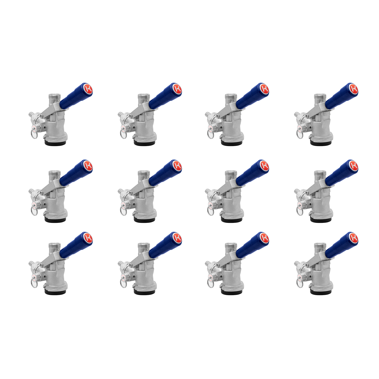 This set of twelve commercial grade Kegco HU-KT5DL-BL "D" System Lever Handle Keg Couplers is great for small breweries and tasting rooms. The HU-KT5DL-BL is compatible with all domestic brand kegs and works with any American "D" system sankey keg. These couplers feature a 55-psi pressure relief valve and a nickel-plated forged brass body with a stainless steel probe and blue lever handle. To tap a keg, simply pull out and then down on the lever handle.