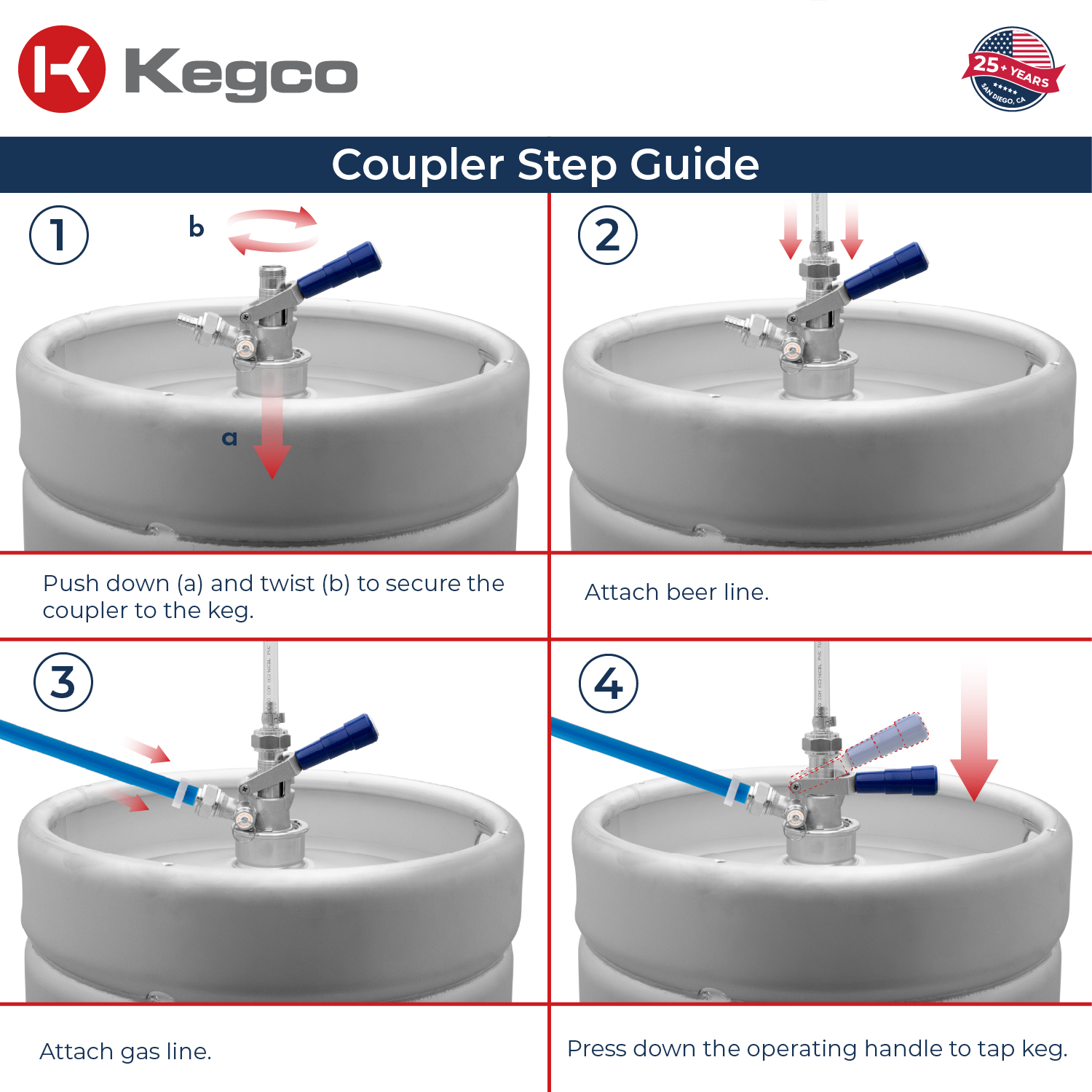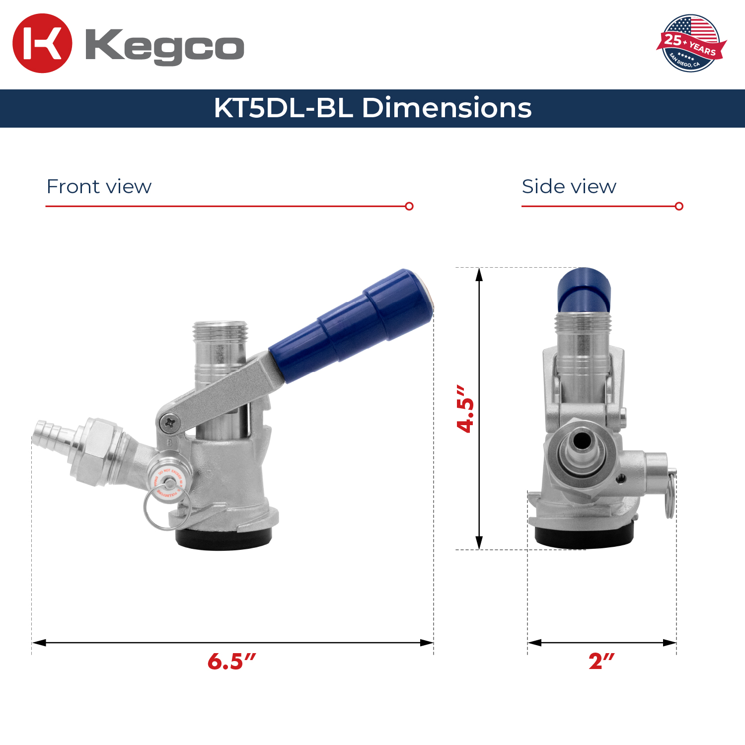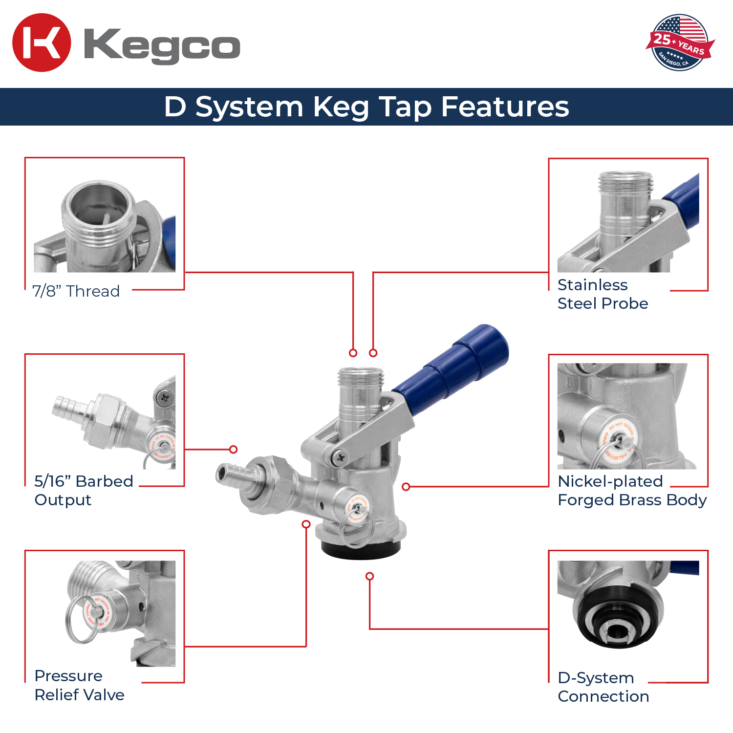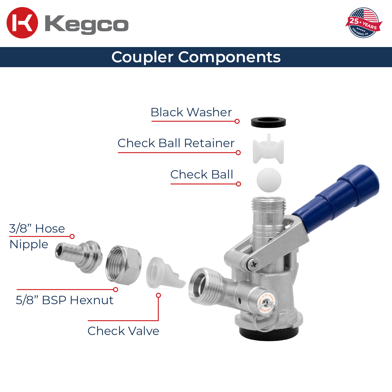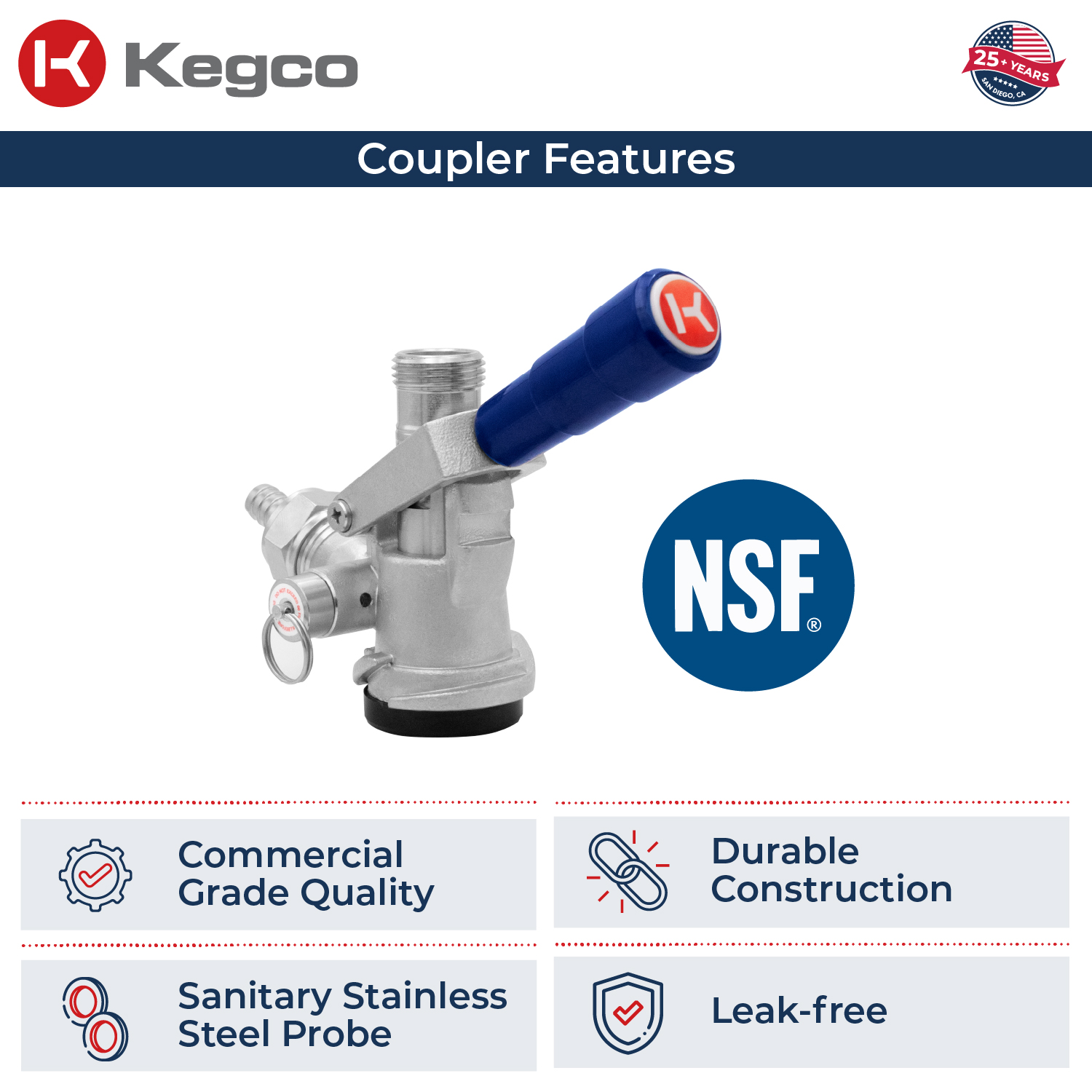This set of twelve commercial grade Kegco HU-KT5DL-BL "D" System Lever Handle Keg Couplers is great for small breweries and tasting rooms. The HU-KT5DL-BL is compatible with all domestic brand kegs and works with any American "D" system sankey keg. These couplers feature a 55-psi pressure relief valve and a nickel-plated forged brass body with a stainless steel probe and blue lever handle. To tap a keg, simply pull out and then down on the lever handle.