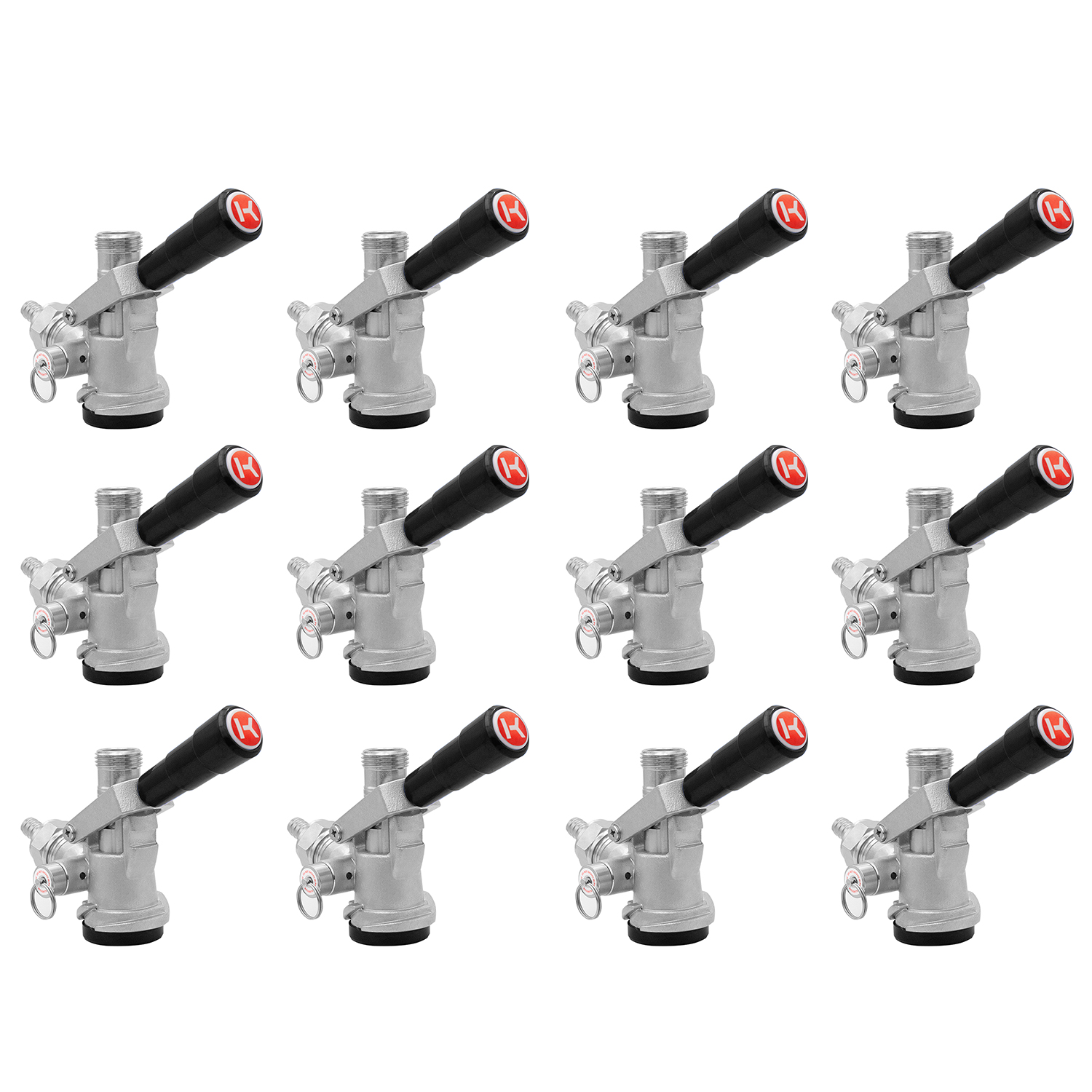 This set of twelve commercial grade Kegco KT85D-L "D" System Lever Handle Keg Couplers is great for small breweries and tasting rooms. The KT85D-L is compatible with all domestic brand kegs and works with any American "D" system sankey keg. These couplers feature a 55-psi pressure relief valve and a nickel-plated forged brass body with a stainless steel probe. To tap a keg, simply pull out and then down on the lever handle.
