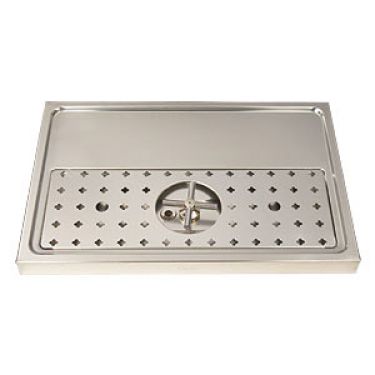 This tray is constructed of heavy gauge stainless steel with a durable plastic rinser. A cold water connection is required. This tray is designed to catch 2-4 faucets. You can plumb cold water to the rinser through a cold plate or through a refrigerated box.
