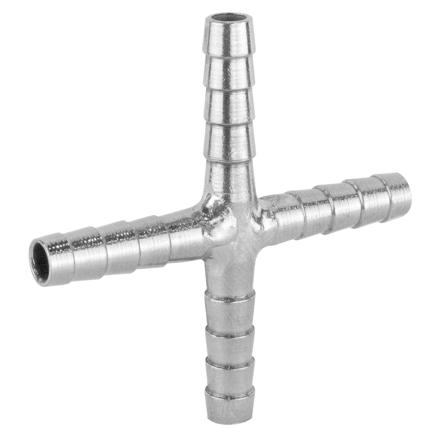 Stainless steel cross fitting for 1/4" I.D. tubing.