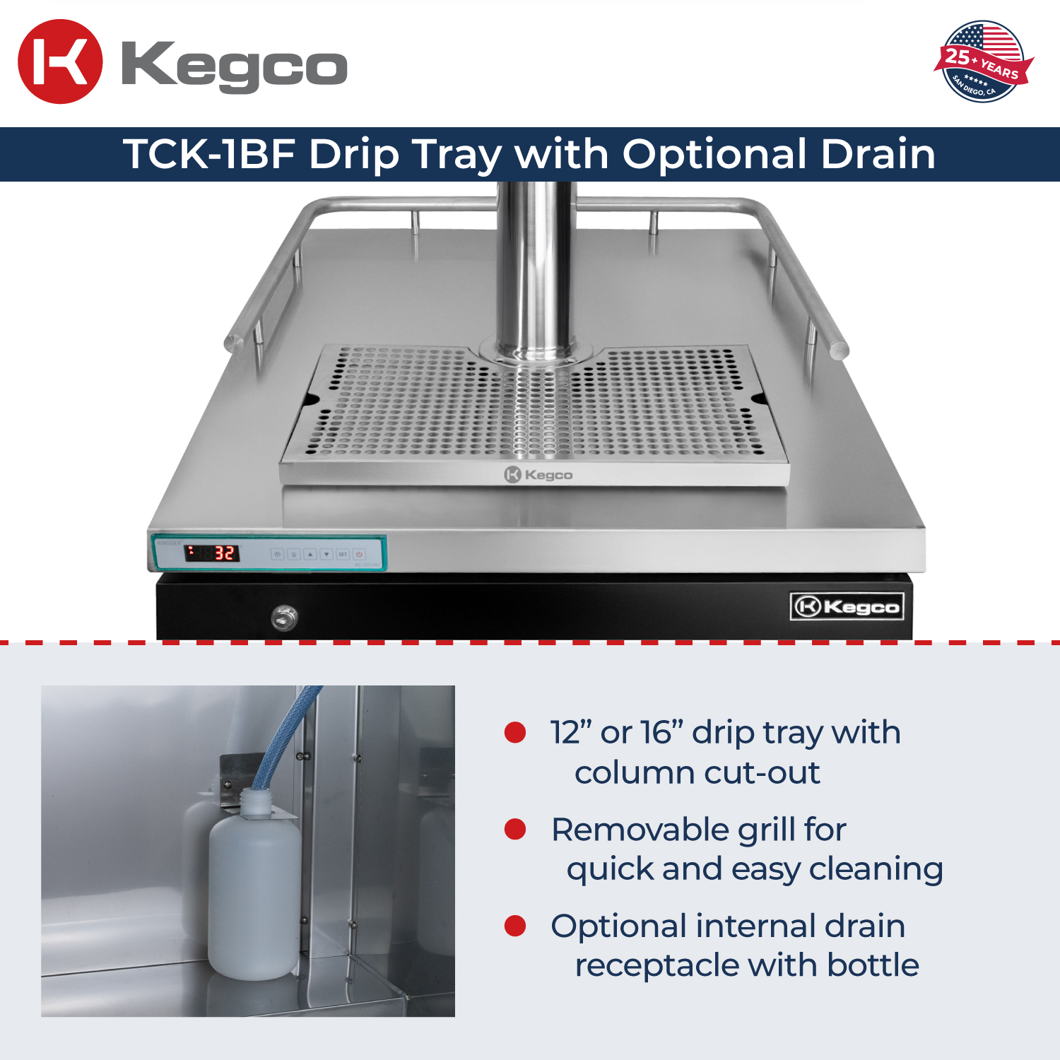 Drip tray comes in standard 12" x 7" or a large 16" x 10" sizes with a column cut out. An internal drain receptacle can be configured to catch any spills from the faucet that are directed into a spill bottle to be easily removed and emptied out.