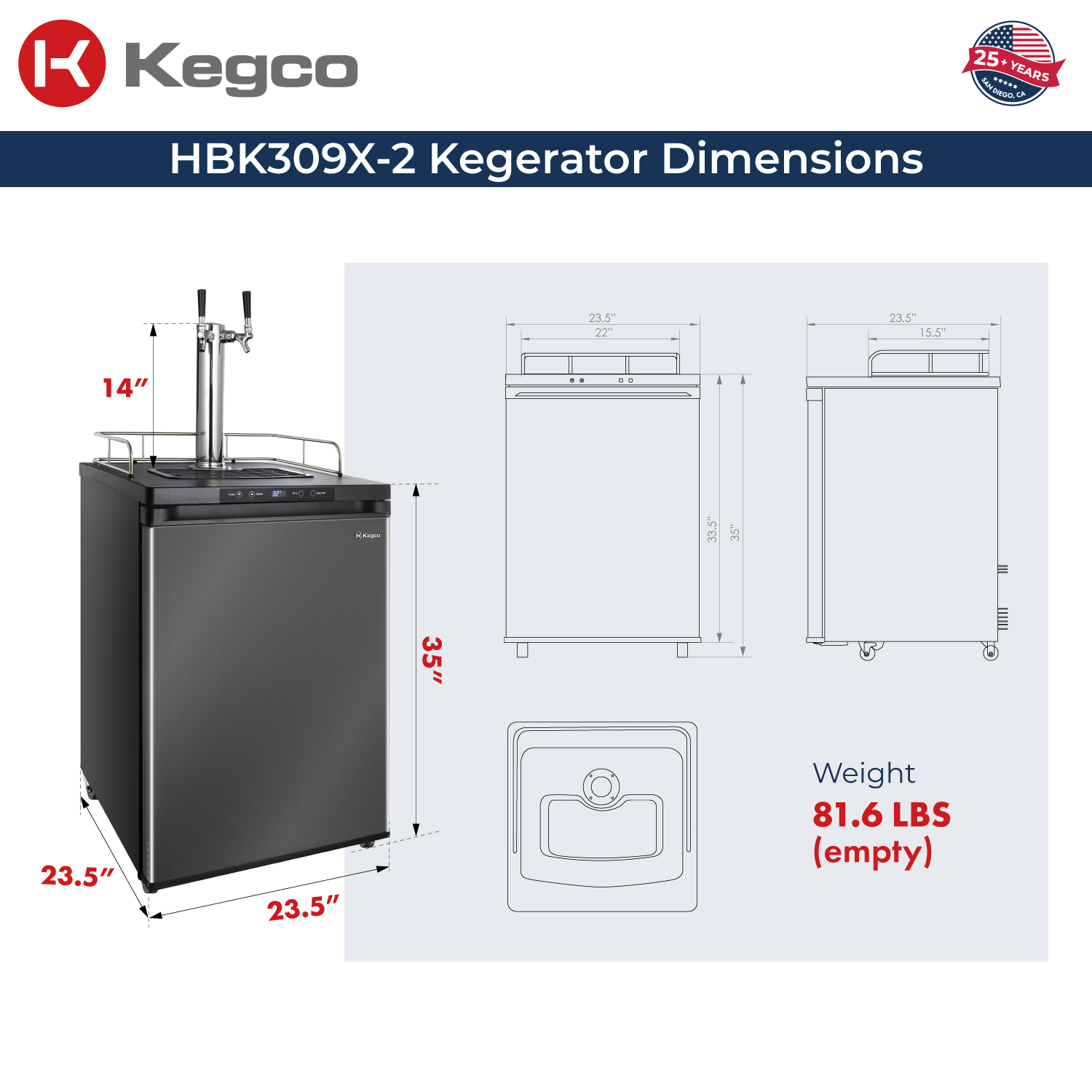 Kegco's HBK309X-2 is an attractive dual faucet kegerator that allows you to dispense up to two of your favorite home brewed beers at the same time! It boasts all of the same great features as other high-quality Kegco draft beer dispensers, as well as a complete two-tap homebrew beer direct draw system that allows you to dispense two kegs at once. This dispense system comes with exciting upgrades like a two faucet stainless steel draft beer tower, commercial grade two product dual gauge regulator, and glossy red 5 lb. aluminum CO2 tank at no additional charge - a $37 value! Comes with a Kegco Exclusive tower that measures 14" tall, giving you an extra 2" of space over standard draft beer towers to allow you to easily fill tall growlers and pint glasses.