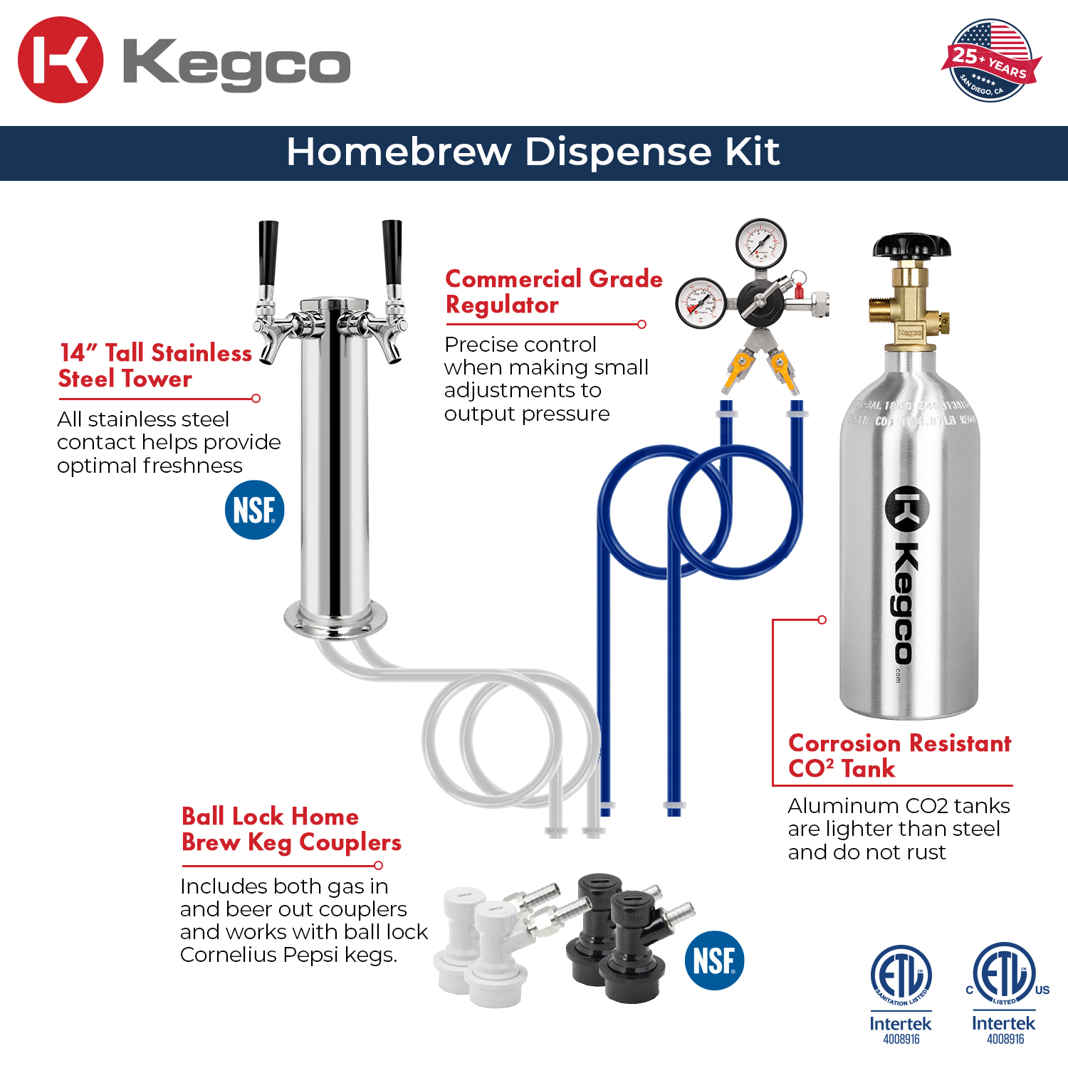 • Includes polished stainless steel two-faucet draft tower, two sets of ball lock keg couplers, empty CO2 tank, and dual gauge regulator