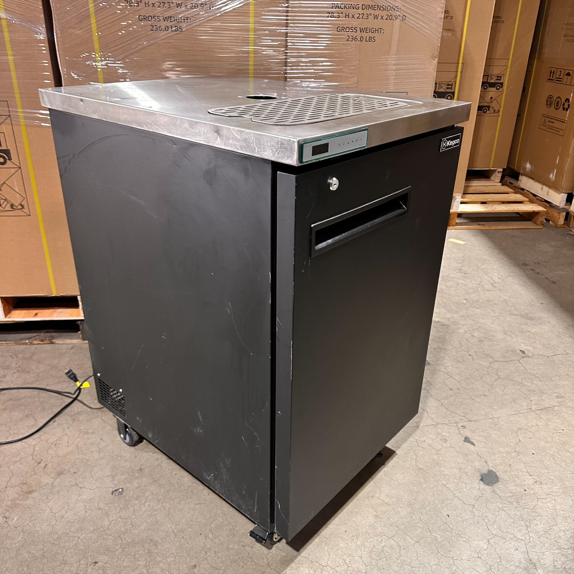 This unit was inspected to ensure it includes all standard parts and manual. It's in good physical condition with exception of scratches and dents on the left, right, top, back, door and cord parts of the unit. (see final photos). Damage does not affect the performance of the unit. Kegerator has been tested to ensure it is in good working condition with a temperature that was verified down to 33°F on the lowest setting.