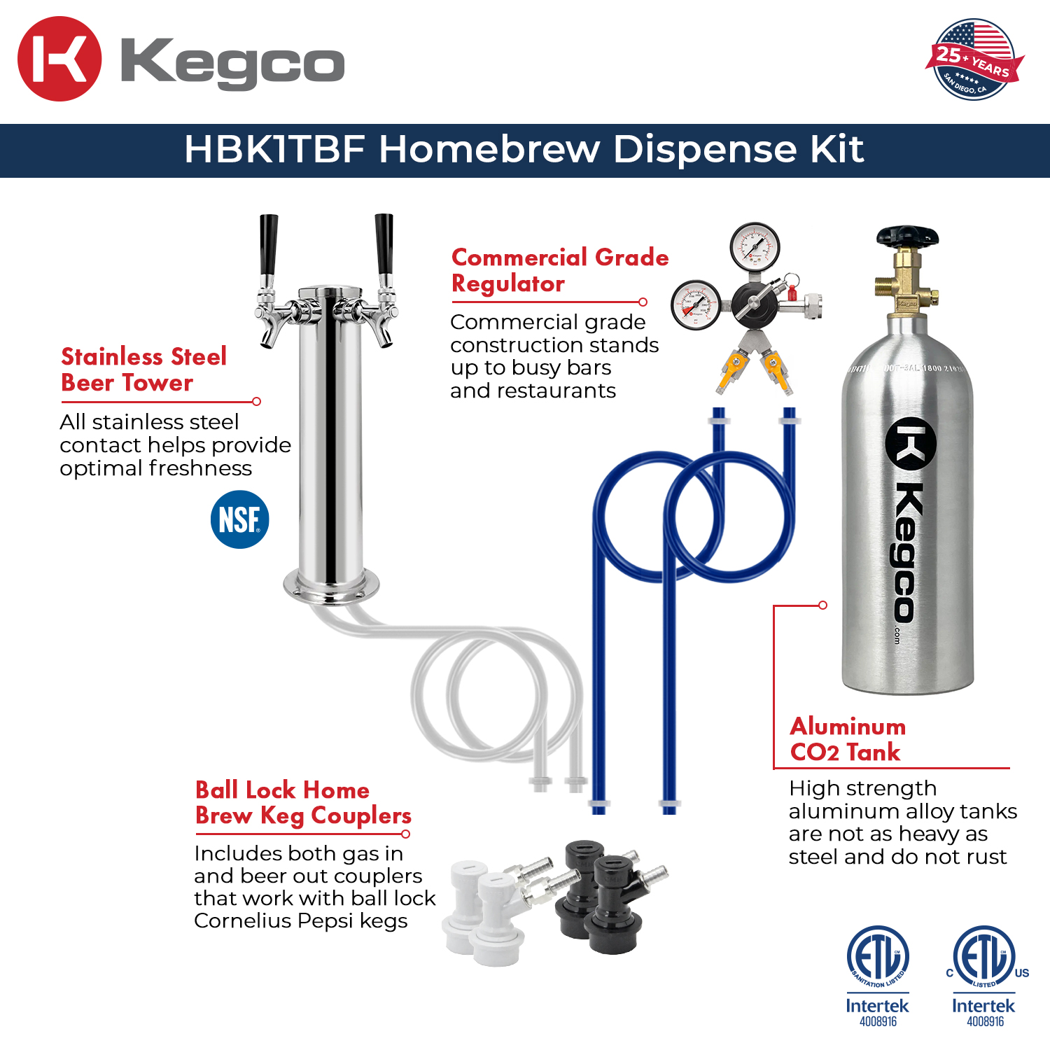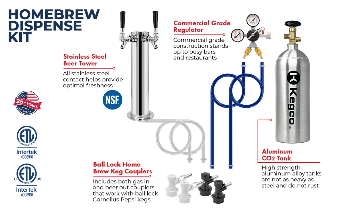 Includes a dual faucet draft tower and a complete ball lock keg dispense kit