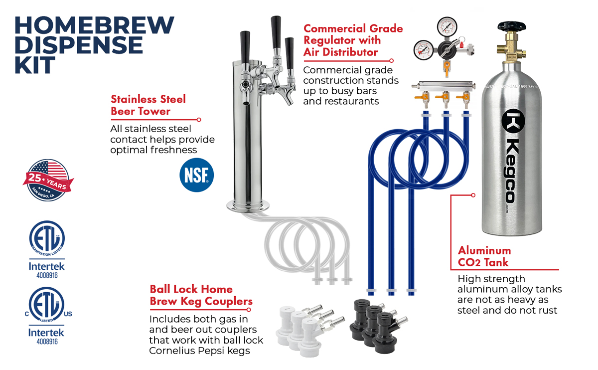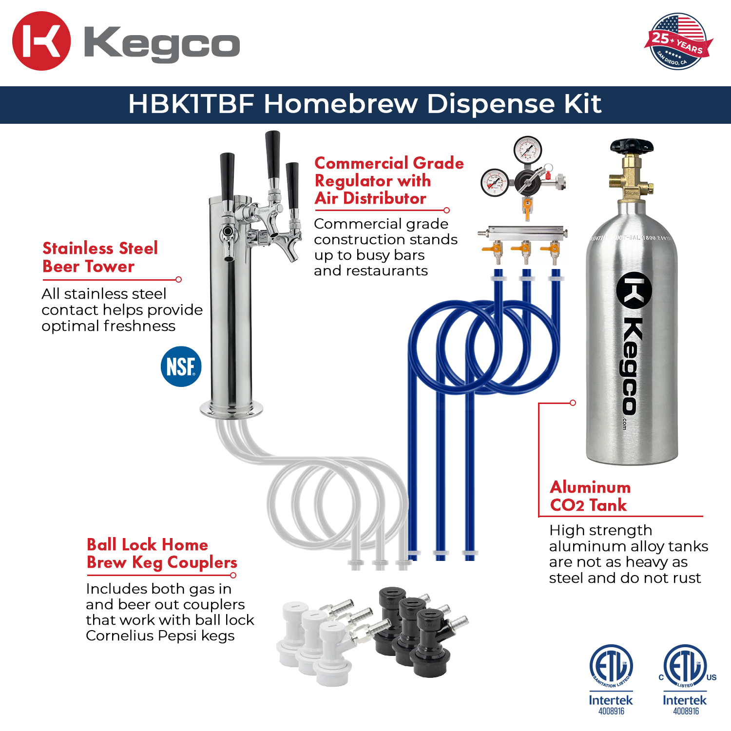 Includes a triple faucet draft tower and a ball lock keg dispense kit
