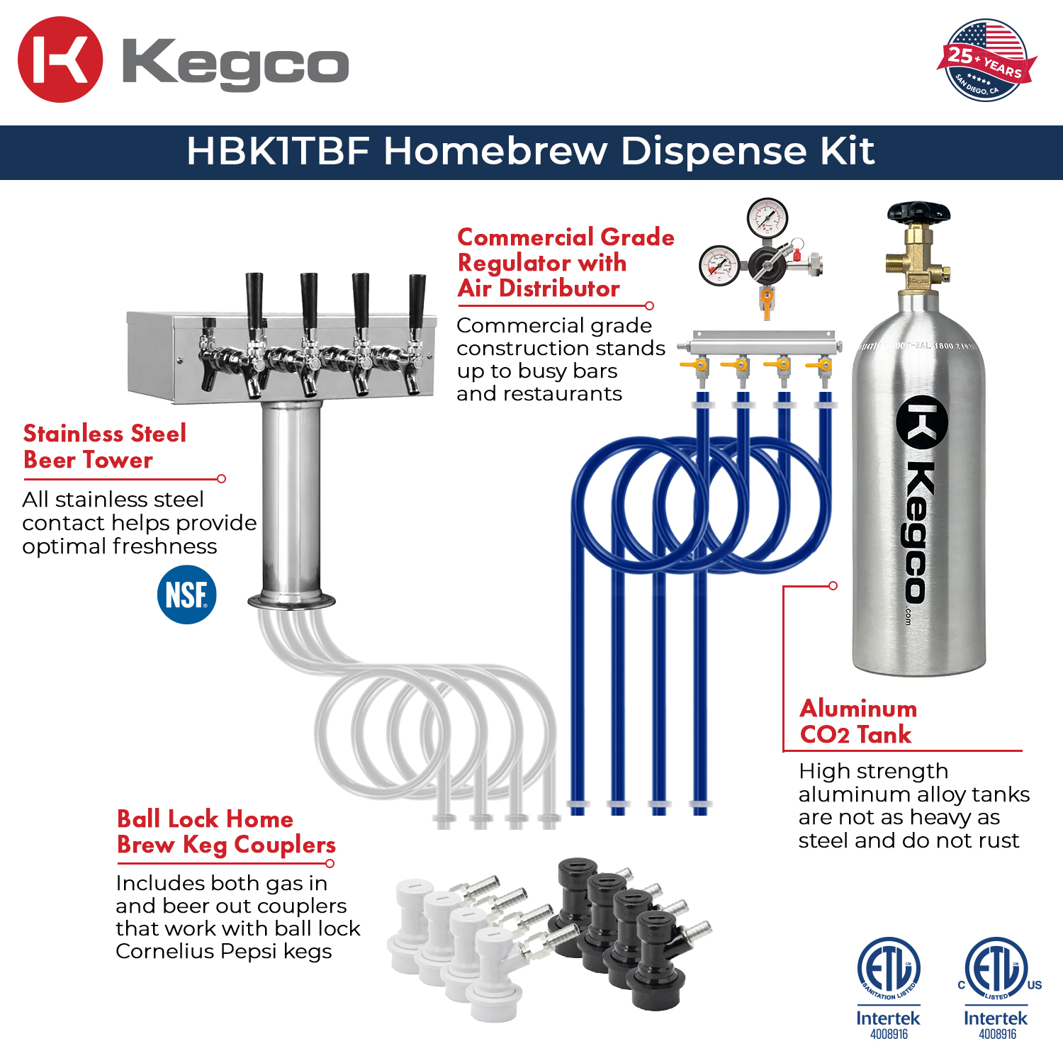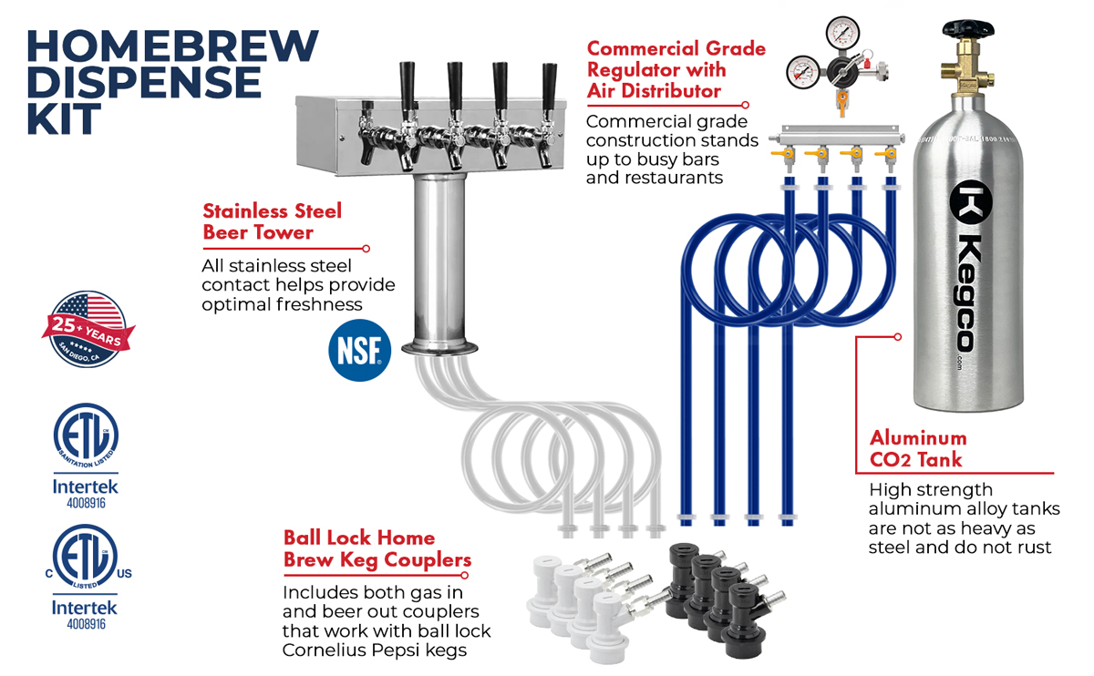 Includes a four faucet draft tower and a complete ball lock dispense kit