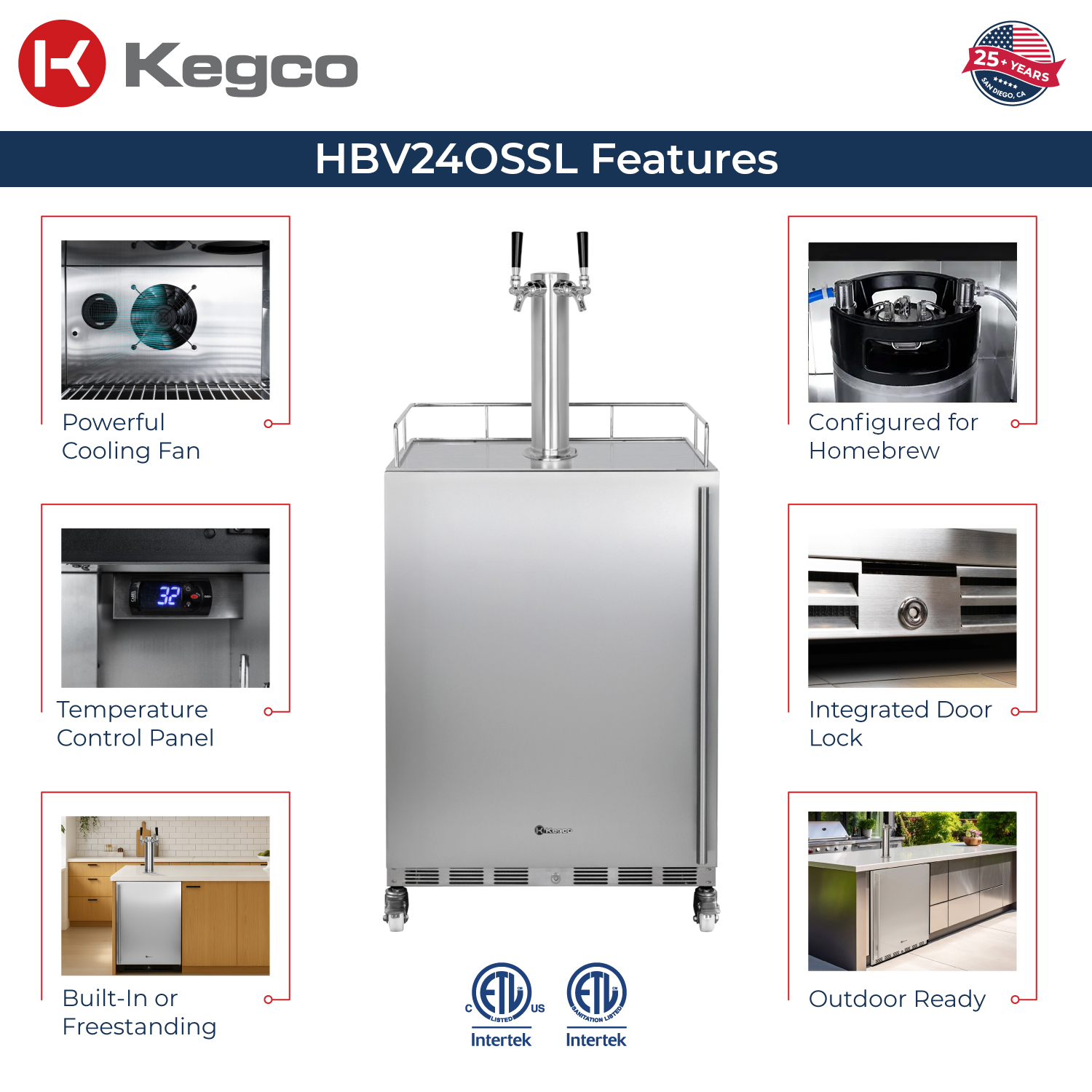 Kegco 24" Wide Outdoor Homebrew Dual Tap All Stainless Steel Built-In Left Hinge Kegerator
