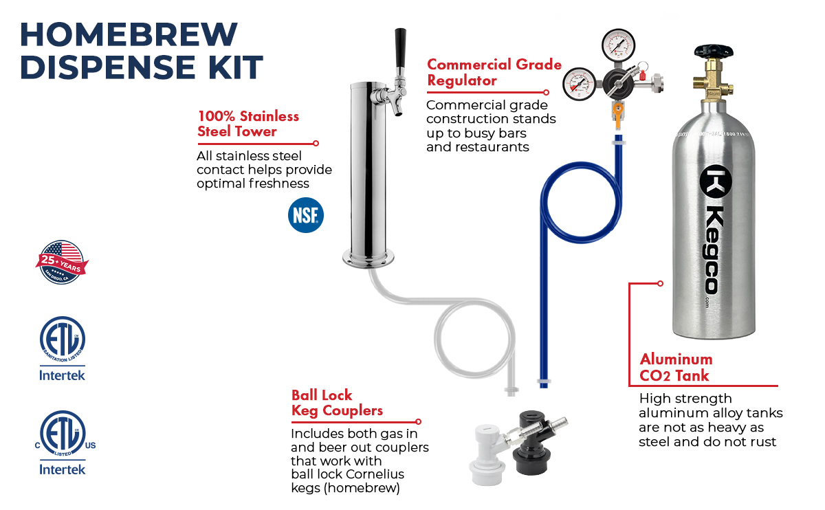 Comes with a set of ball lock barb connectors that meet the unique requirements of dispensing home brew beer. Includes both a gas in and beer out coupler that works with ball lock Cornelius Pepsi kegs.