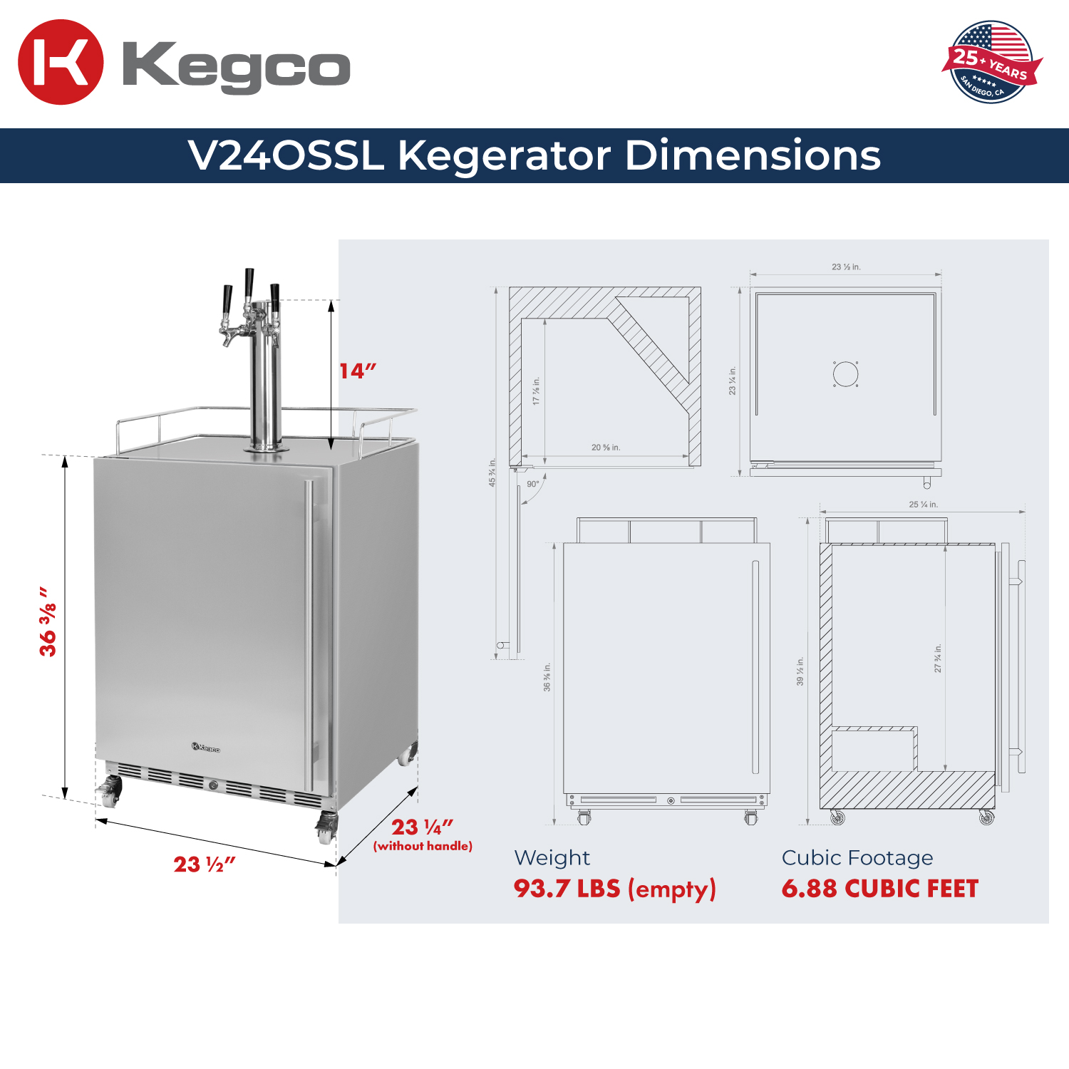 Kegco 24" Wide Outdoor Triple Tap All Stainless Steel Built-In Left Hinge Kegerator