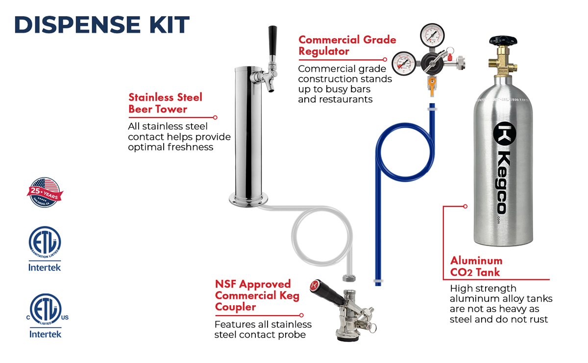 Premium dispense components include a 100% stainless steel contact tower, a premium dual gauge regulator and a corrosion-resistant CO2 tank