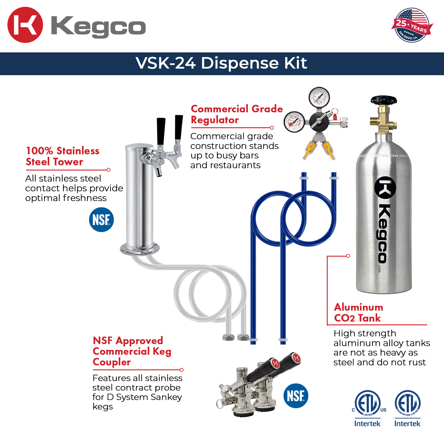 Premium dispense components include a 100% stainless steel contact tower, a premium dual gauge regulator and a corrosion-resistant CO2 tank
