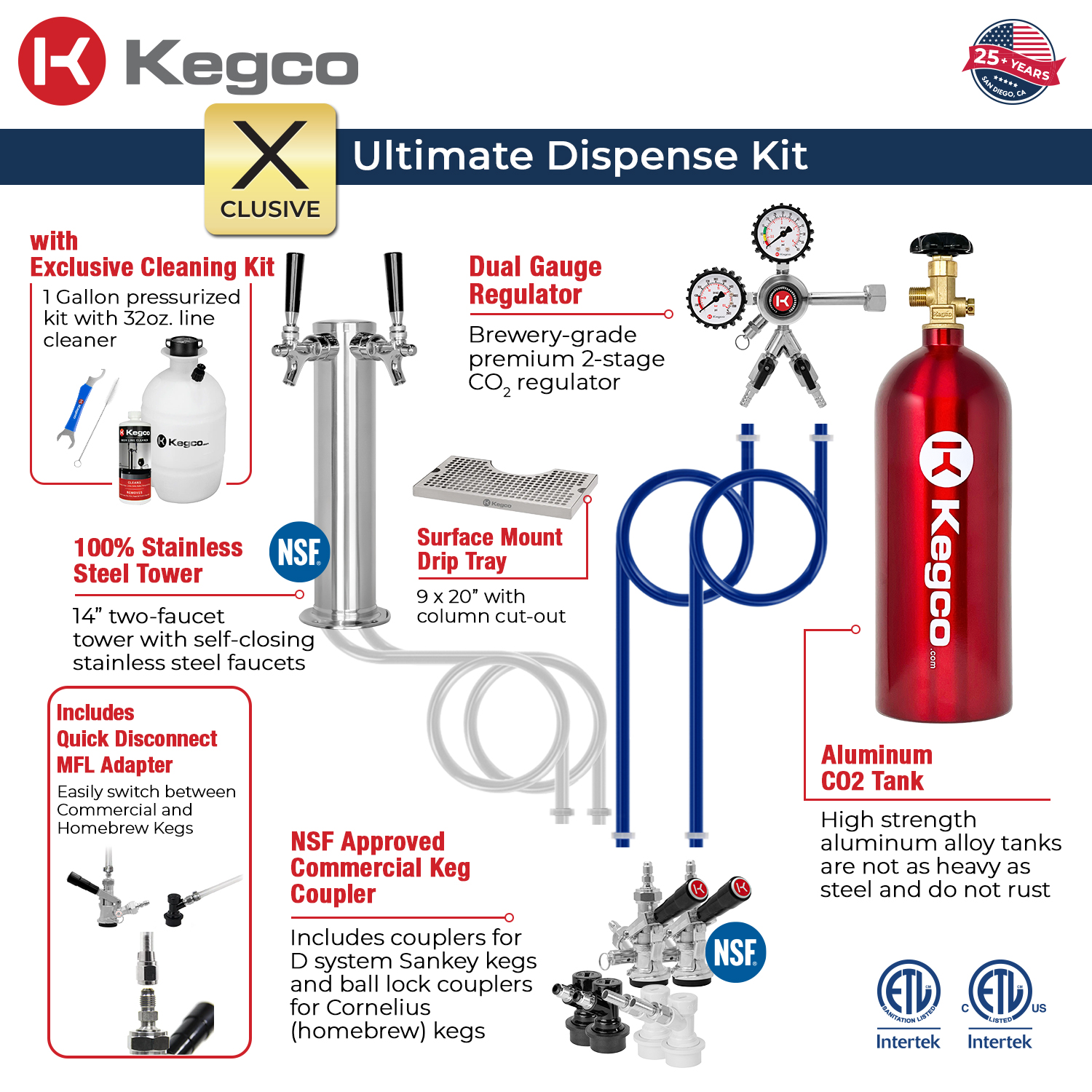 Exclusive Dispense Kit includes a 100% stainless steel contact tower, a premium dual gauge regulator, a corrosion-resistant CO2 tank, a stainless steel drip tray and a cleaning kit