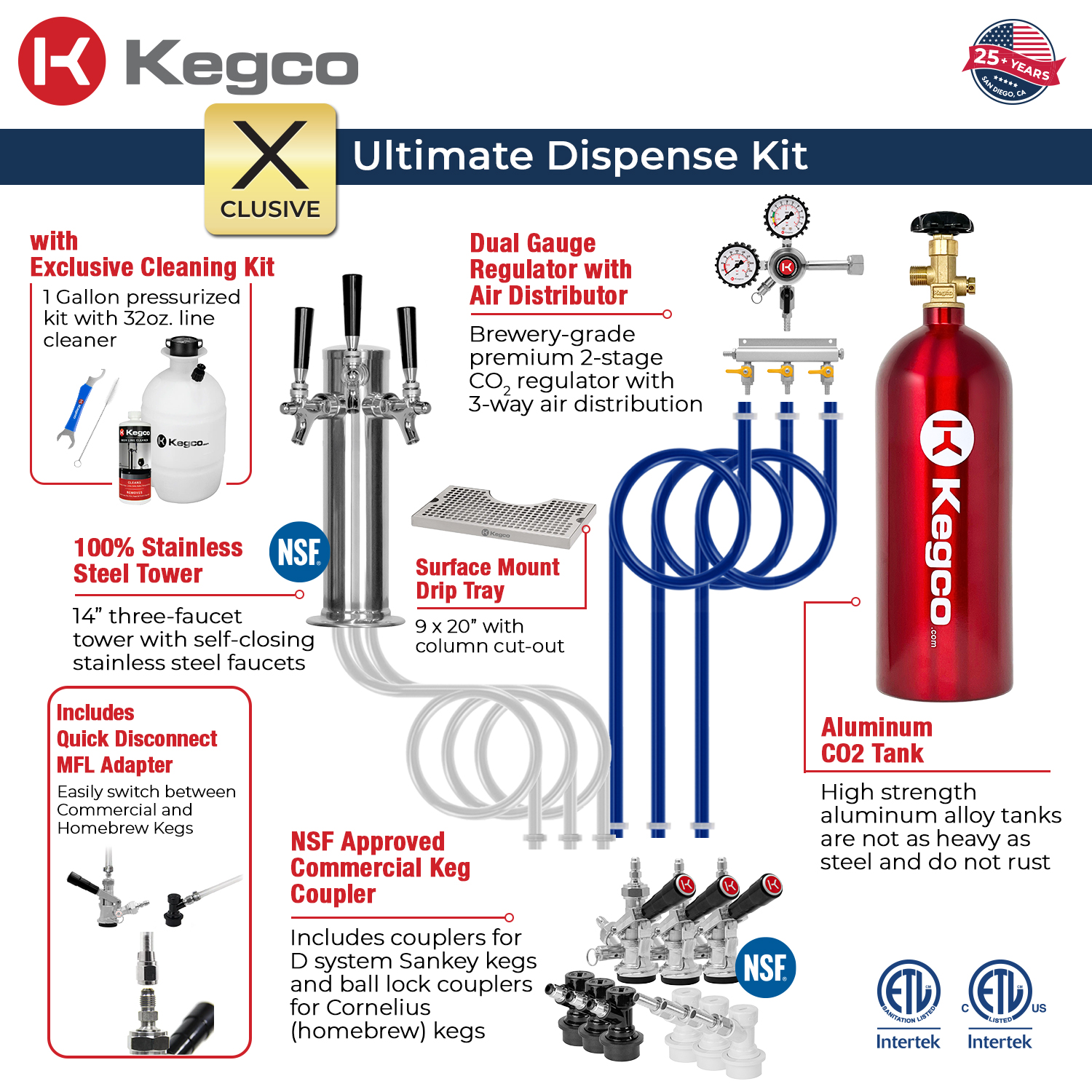Exclusive Dispense Kit includes a 100% stainless steel contact tower, a premium dual gauge regulator, a corrosion-resistant CO2 tank, a stainless steel drip tray and a cleaning kit