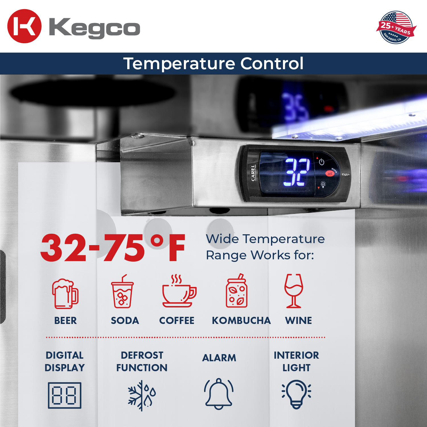 Easily adjust and view the set temperature, toggle between Celsius and Fahrenheit, or turn the interior light on and off with the push of a button. The temperature can be set between 32-75 degrees Fahrenheit to serve beer, wine, kombucha, or coffee.