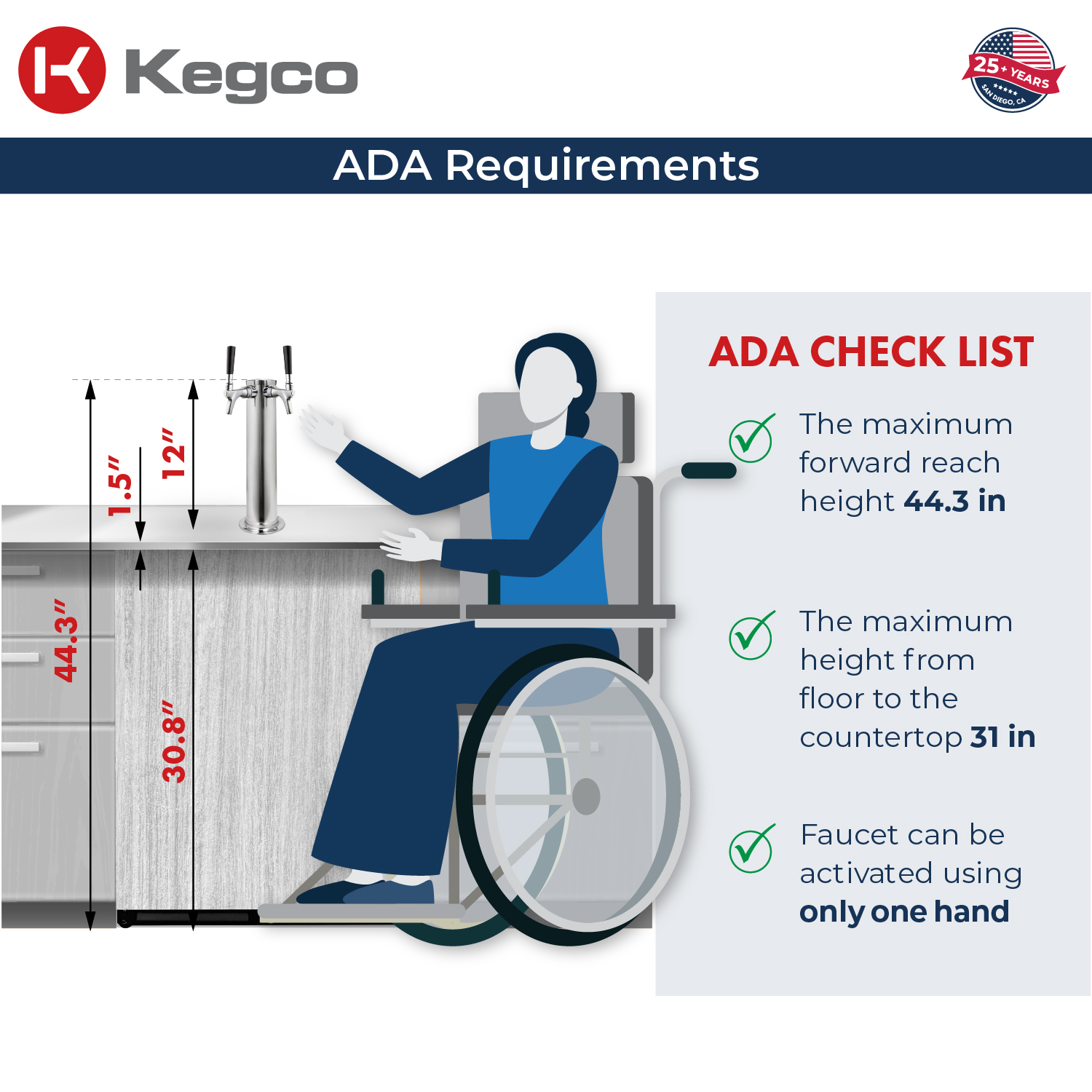 ADA-Compliant Height. At just 31 inch tall, this is the lowest ADA-compliant kegerator available, designed for universal accessibility without sacrificing performance.