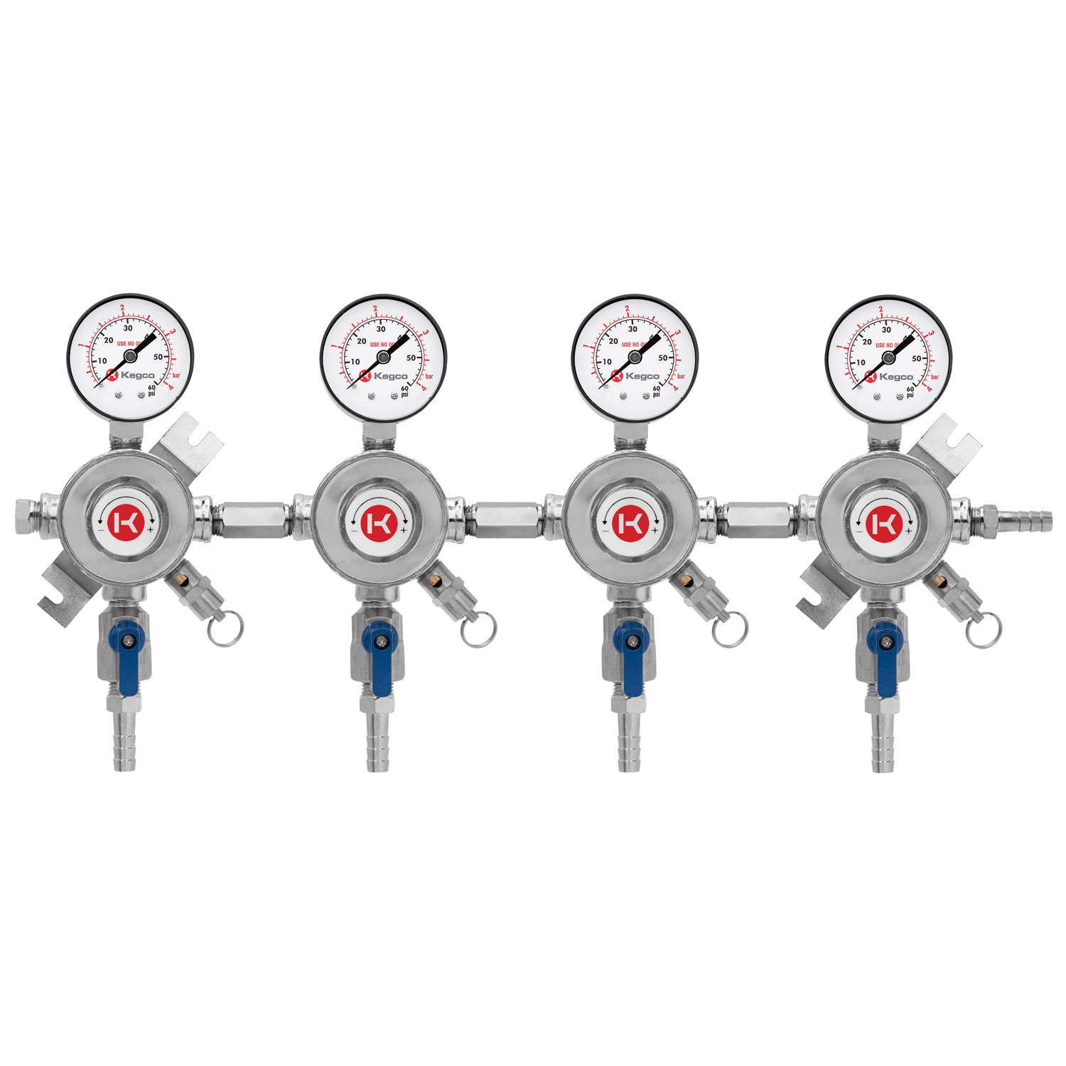 - Connects to a primary regulator with air line to allow you to lower the pressure to each keg individually