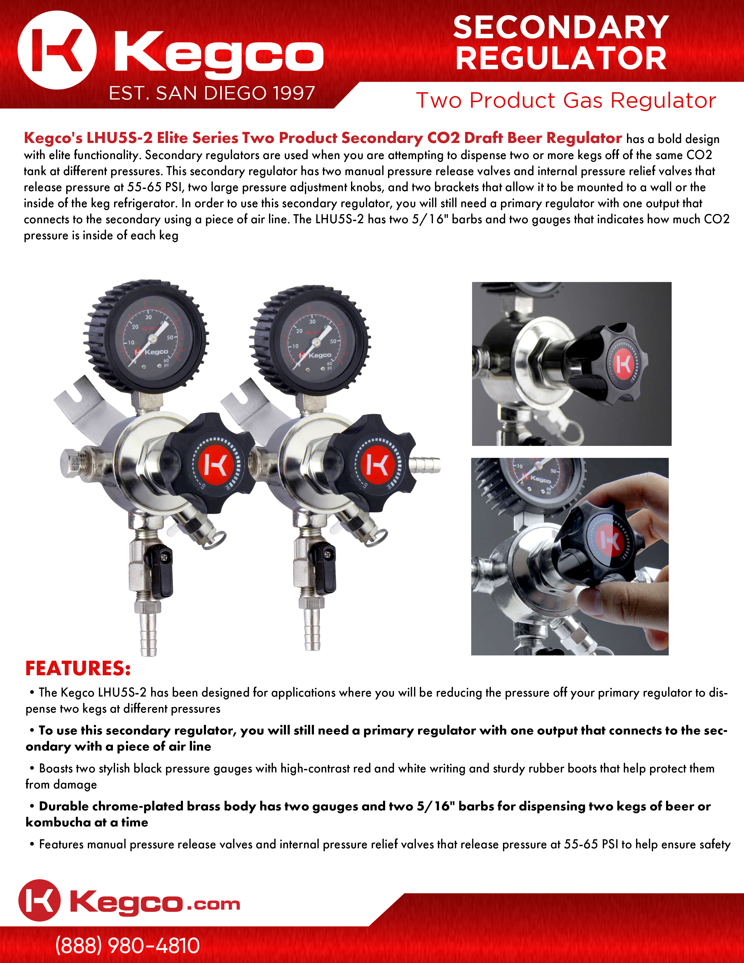 Kegco's LHU5S-2 Elite Series Two Product Secondary CO2 Draft Beer Regulator has a bold design with elite functionality. Secondary regulators are used when you are attempting to dispense two or more kegs off of the same CO2 tank at different pressures. This secondary regulator has two manual pressure release valves and internal pressure relief valves that release pressure at 55-65 PSI, two large pressure adjustment knobs, and two brackets that allow it to be mounted to a wall or the inside of the keg refrigerator. In order to use this secondary regulator, you will still need a primary regulator with one output that connects to the secondary using a piece of air line. The LHU5S-2 has two 5/16" barbs and two gauges that indicates how much CO2 pressure is inside of each keg.