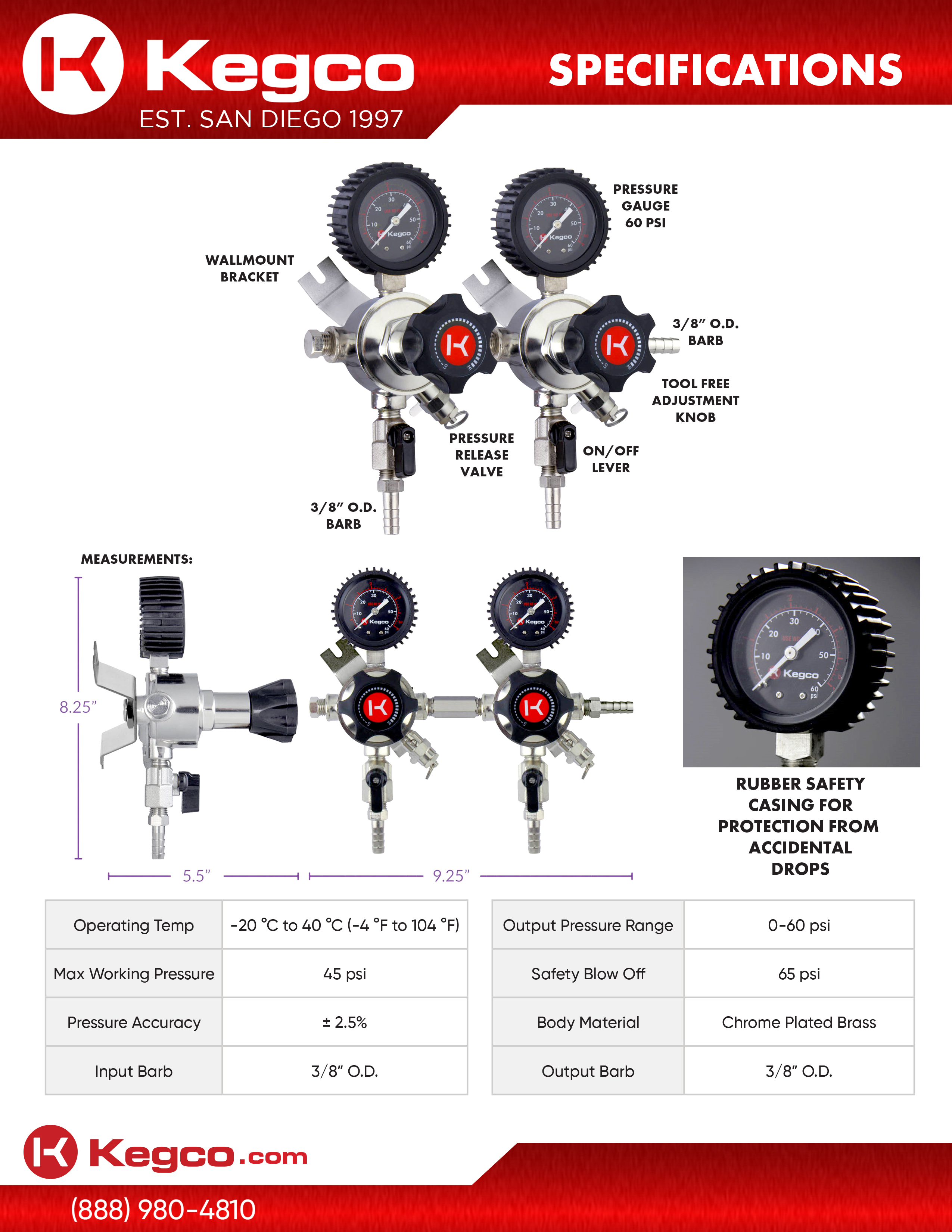 Constructed from sturdy chrome-plated brass, this regulator also features a dependable rubber boot on each pressure gauge to protect the gauges from damage.