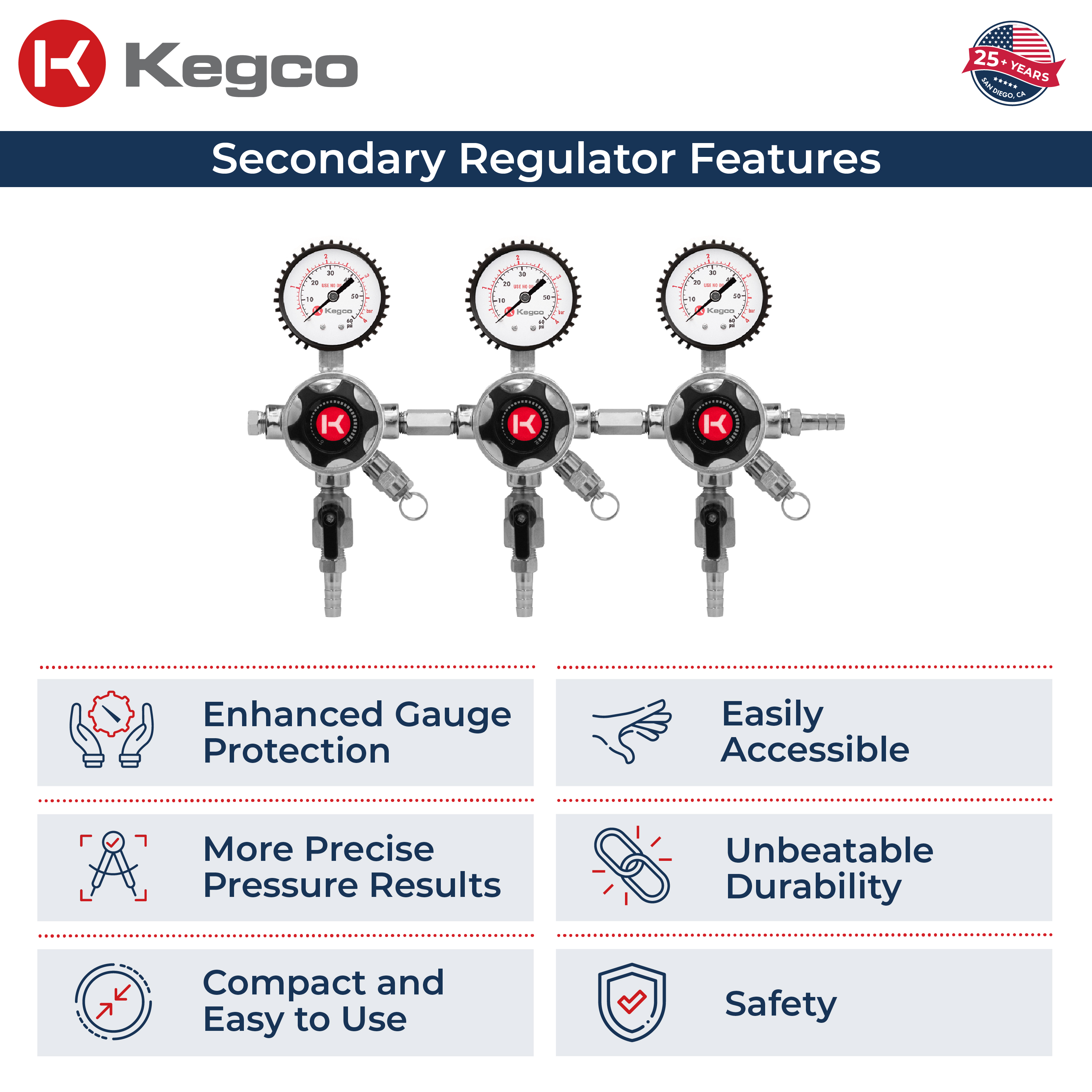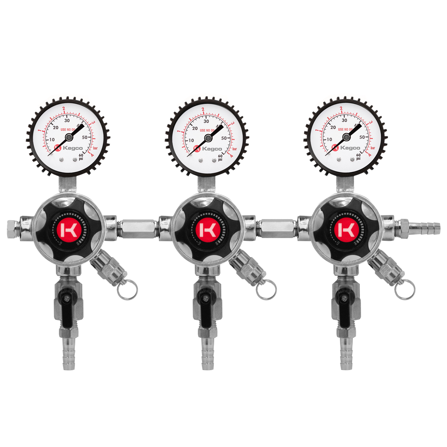 This regulator's sophisticated design boasts four bold black gauges with high-contrast red and white text that is both stylish and easy to read. Four matching black plastic handles and black shut-off knobs add to the sleek look.
