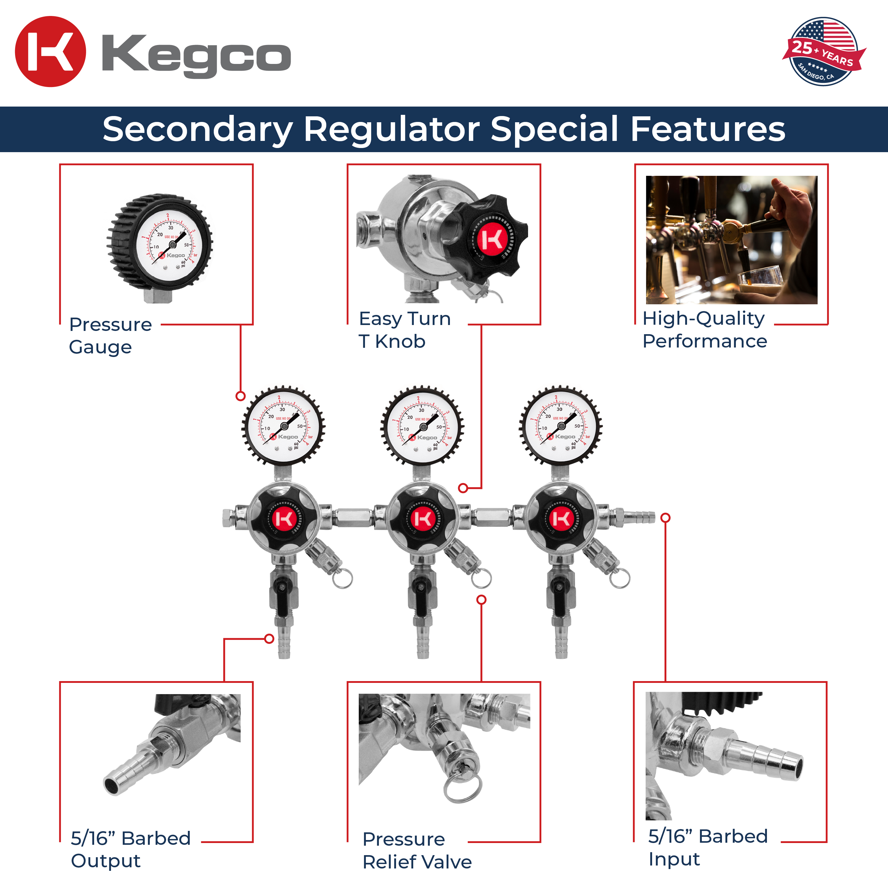 Kegco's LHU5S-3 Elite Series Three Product Secondary CO2 Draft Beer Regulator has a bold design with elite functionality. Secondary regulators are used when you are attempting to dispense two or more kegs off of the same CO2 tank at different pressures. This secondary regulator has three manual pressure release valves and internal pressure relief valves that release pressure at 55-65 PSI, three large pressure adjustment knobs, and three brackets that allow it to be mounted to a wall or the inside of the keg refrigerator. In order to use this secondary regulator, you will still need a primary regulator with one output that connects to the secondary using a piece of air line. The LHU5S-3 has three 5/16" barbs and three gauges that indicate how much CO2 pressure is inside of each keg.
