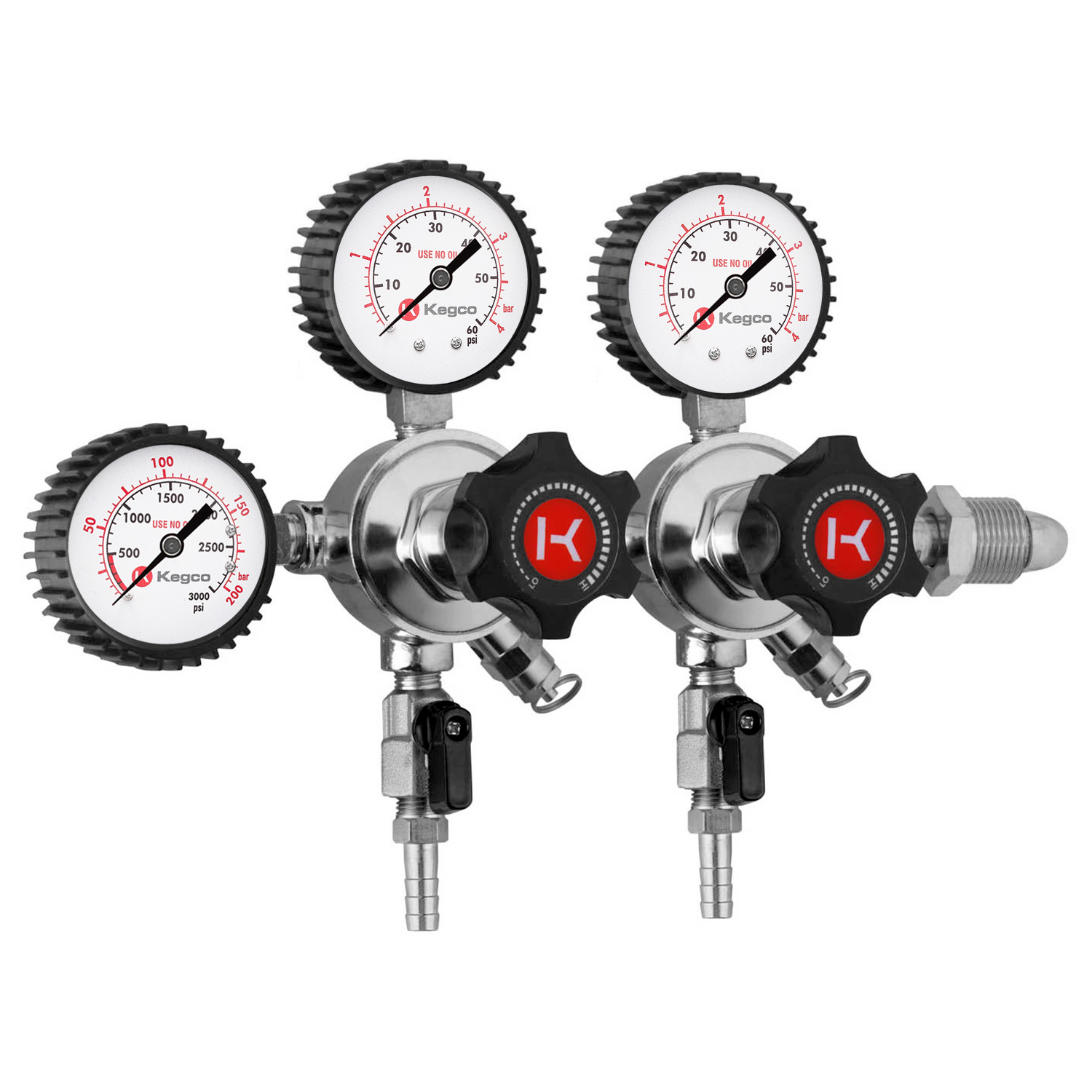 Kegco's LHU5NDB Elite Series Dual Body Nitrogen Draft Beer Regulator has a bold design with elite functionality. Designed for applications where two kegs of stout beer, coffee, or wine will be dispensed at two different pressures, it boasts three gauges that display both the pressure in each of the kegs and the volume of gas remaining in the cylinder, so you won't be caught off guard by an empty gas tank in the middle of a party. This regulator has a dual body design that features two 5/16" barbs and two large adjustment knobs that are easy to grip and turn for precise pressure placement. For added safety, it also has manual pressure release valves and internal pressure relief valves that release pressure at 55-65 PSI. A sintered metal filter has been built into the stem to keep harmful contaminants out of the regulator, so you'll be using it to enjoy beer after beer for years to come. This nitrogen regulator is compatible with high pressure tanks with CGA-580 valves.
