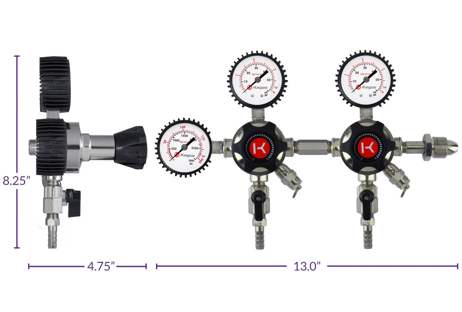 This regulator's sophisticated design boasts four bold black gauges with high-contrast red and white text that is both stylish and easy to read. Four matching black plastic handles and black shut-off knobs add to the sleek look.