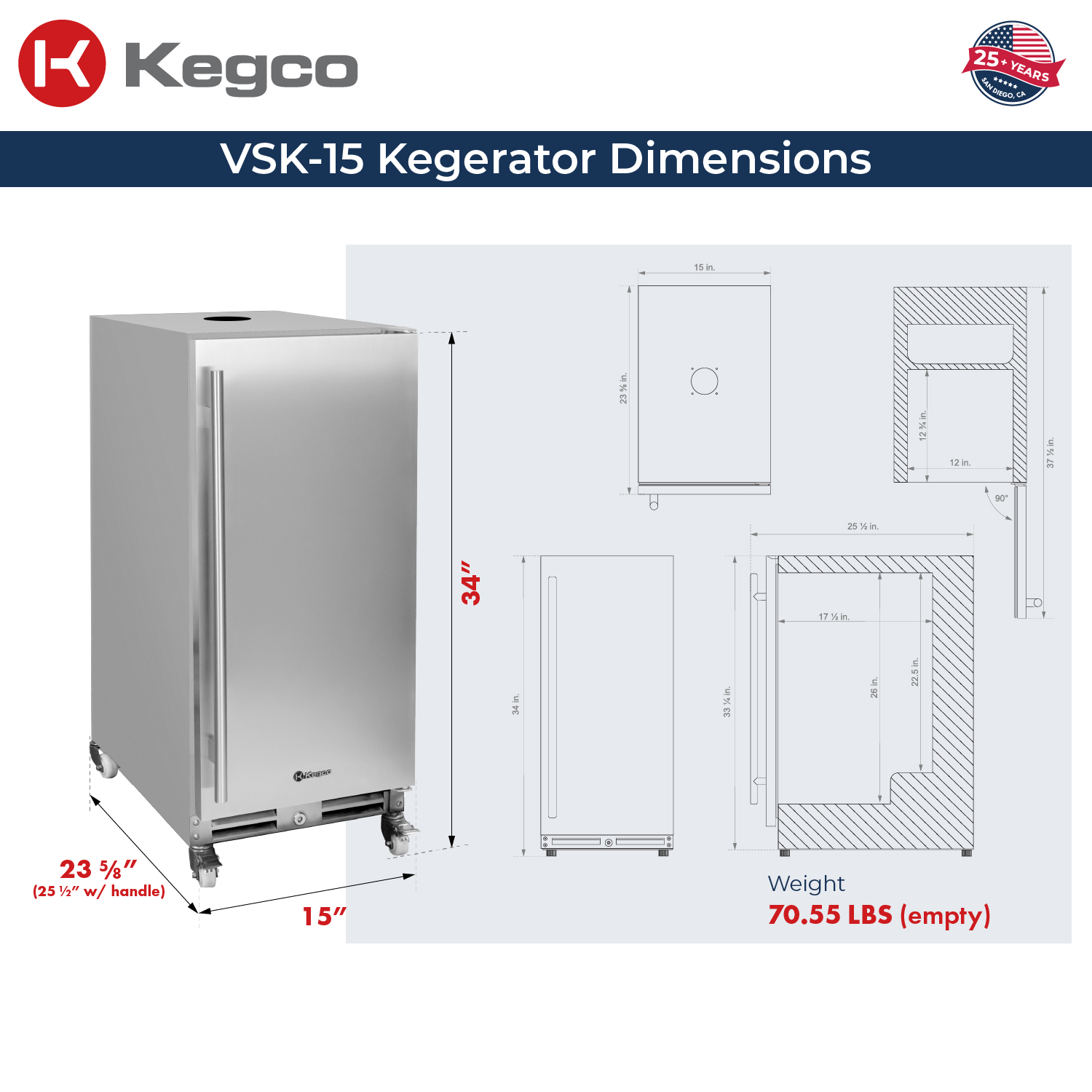 - Dimensions: 15" W x 35-5/8" H x 23-1/4" D (25" w/ handle)