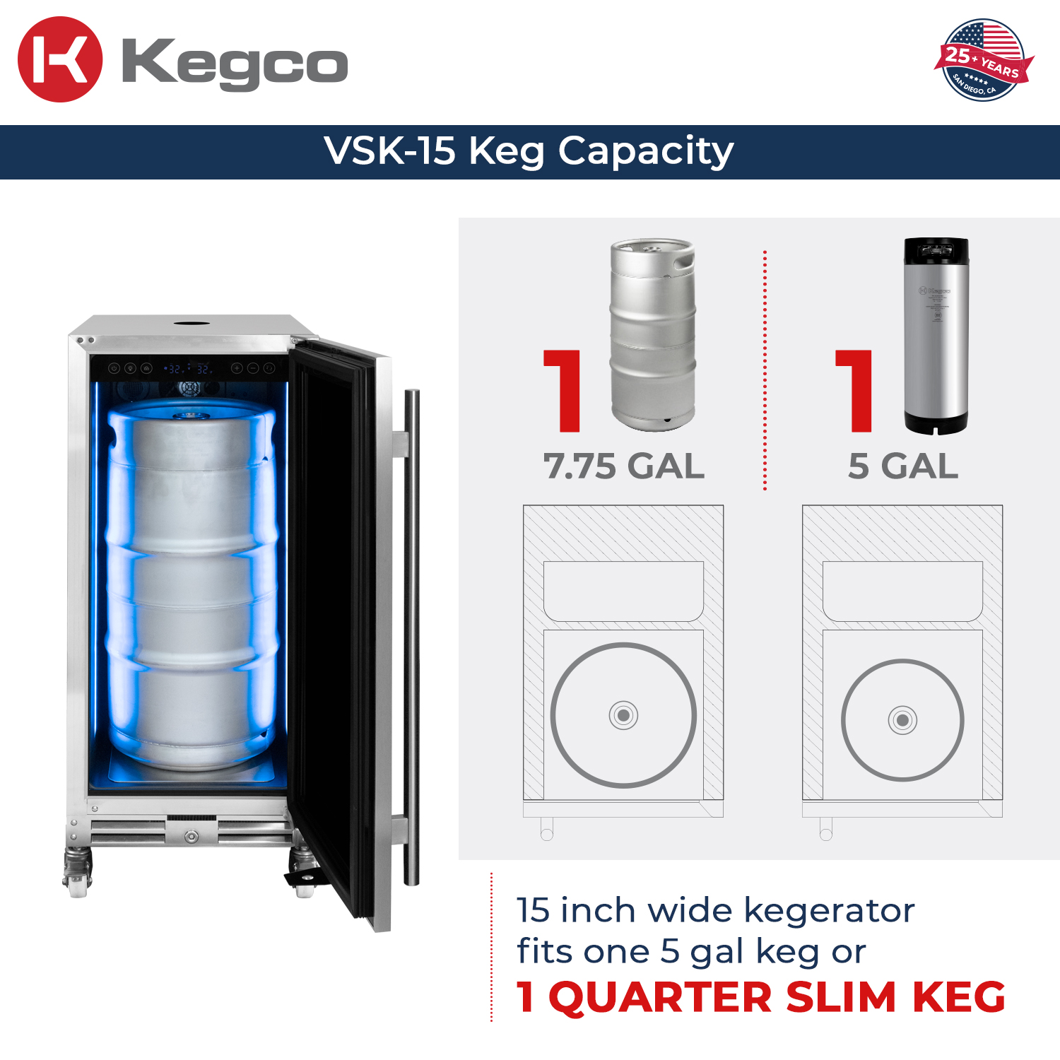 - Compact design that is capable of accommodating 7.75 gallon quarter slim kegs as well as 5 gallon sankey or homebrew kegs