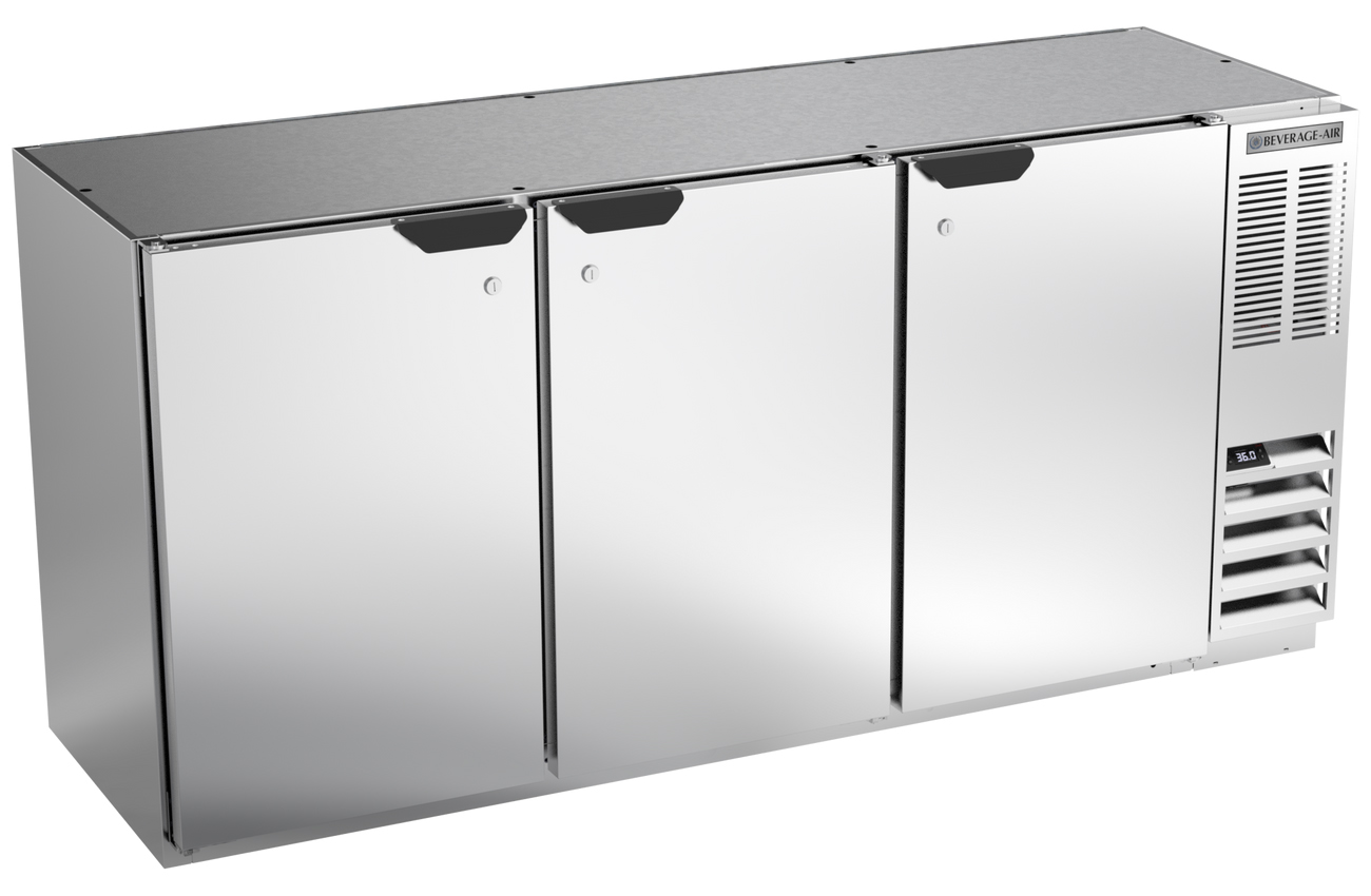 The Beverage-Air BB72HC-1-F-S Food Rated Back Bar Refrigerator features a stainless steel front and sides with 3 solid stainless steel doors. The 19.92 cu.ft. stainless steel interior includes six epoxy coated shelves and LED lighting.