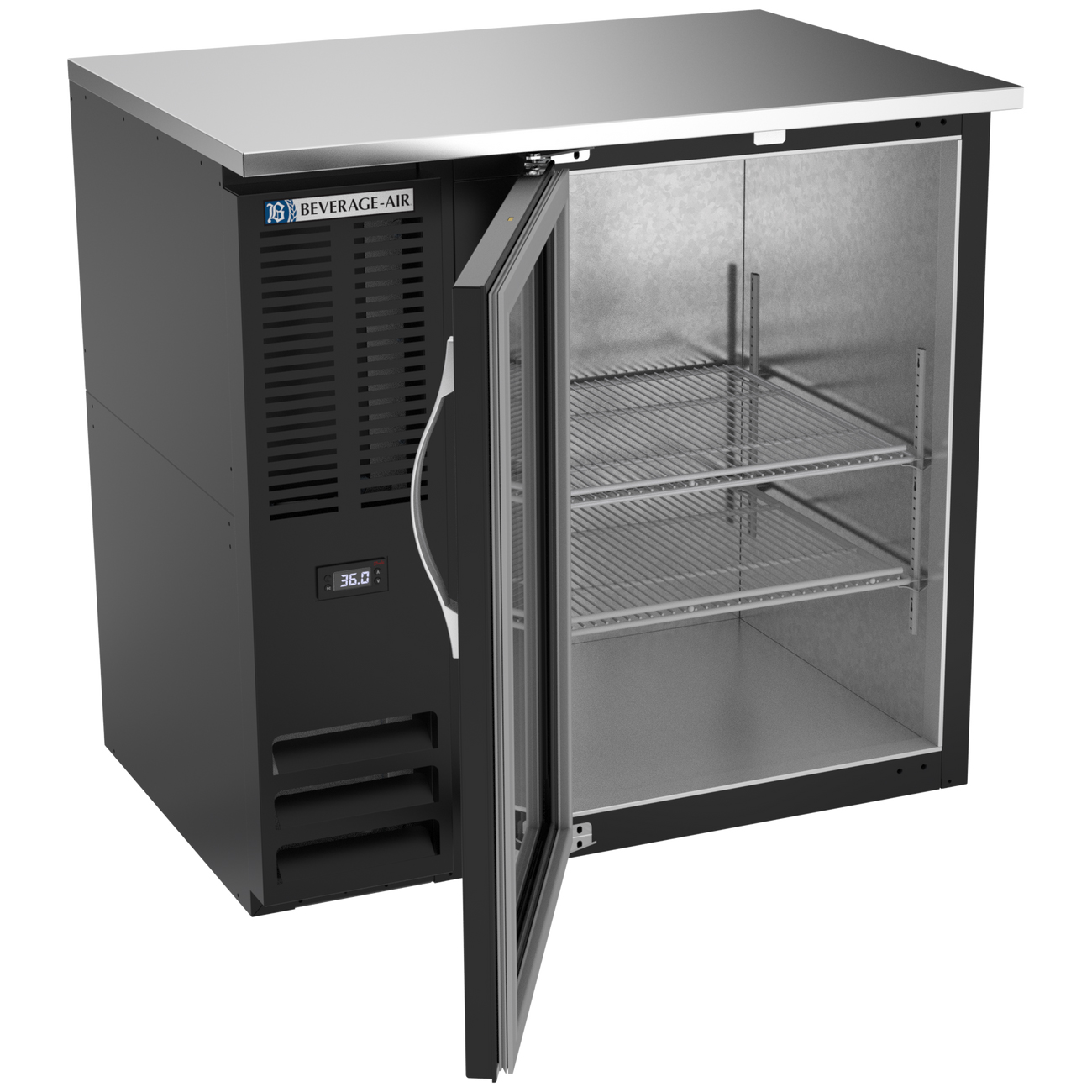 This 8.43 cubic foot Beverage-Air BBN36HC-G-B 36" Narrow Depth Back Bar Refrigerator features a black painted steel exterior and a galvanized steel interior with 2 shelves.