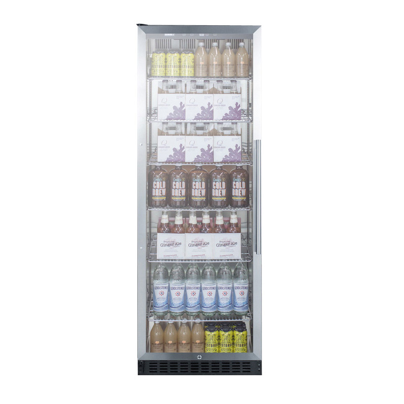The SCR1401LHCSS is an upright beverage center conveniently sized with a slim 24 inch footprint. The stainless steel trimmed glass door provides a full view of storage down to the floor, with recessed LED lighting to ensure an attractive and efficient presentation. The door comes in a left hand door swing and features a self-closing design to help protect stored items in commercial settings where customers may not take the time to ensure a tight seal. A factory installed lock offers additional security. This unit has a fully finished 304 grade stainless steel wrapped cabinet and is designed for freestanding indoor use.