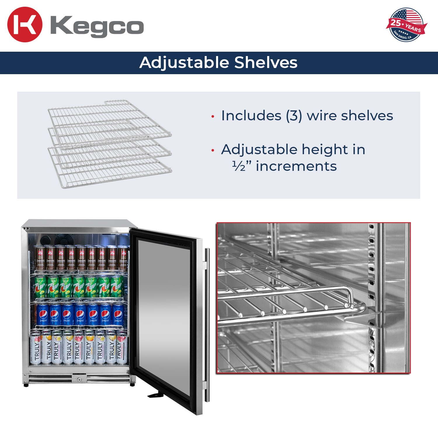 Sturdy metal construction shelves (3) can be adjusted in 1/2" increments to give more space for taller can and bottles - Digital Temperature Control: