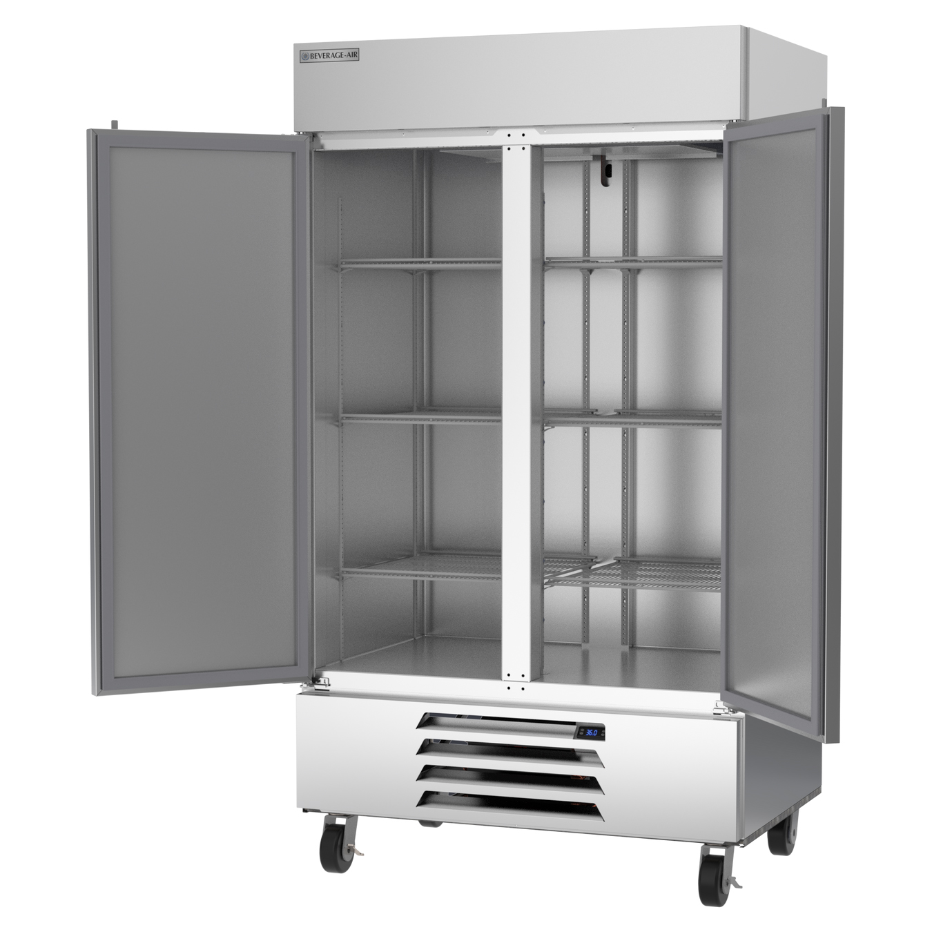 This 47" wide Beverage-Air HBR44HC-1 40.2 Cu. Ft. Two Solid Door Reach-In Refrigerator features an all stainless steel exterior and interior. It has a bottom mounted compressor, and comes with 6 heavy duty epoxy coated wire shelves.