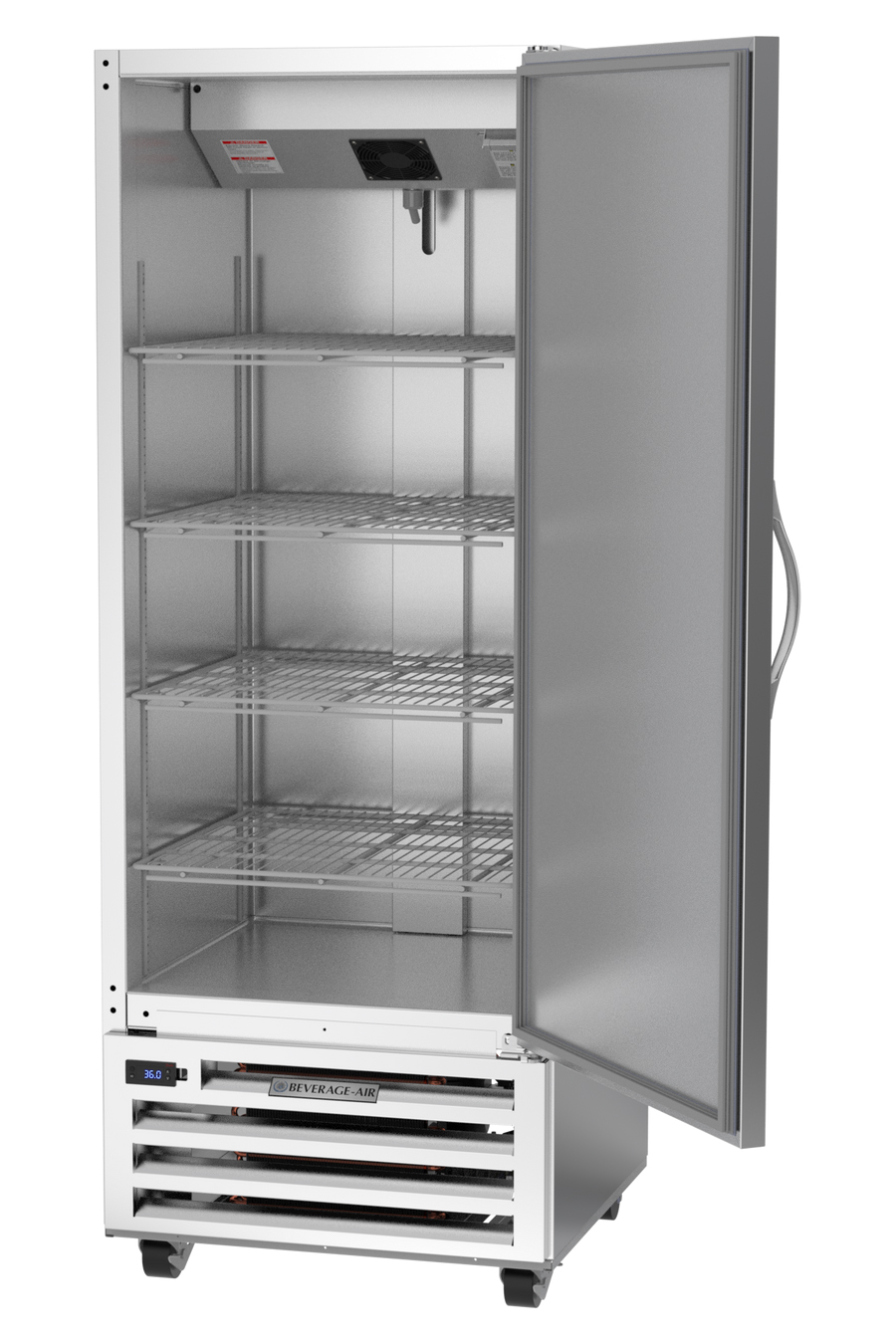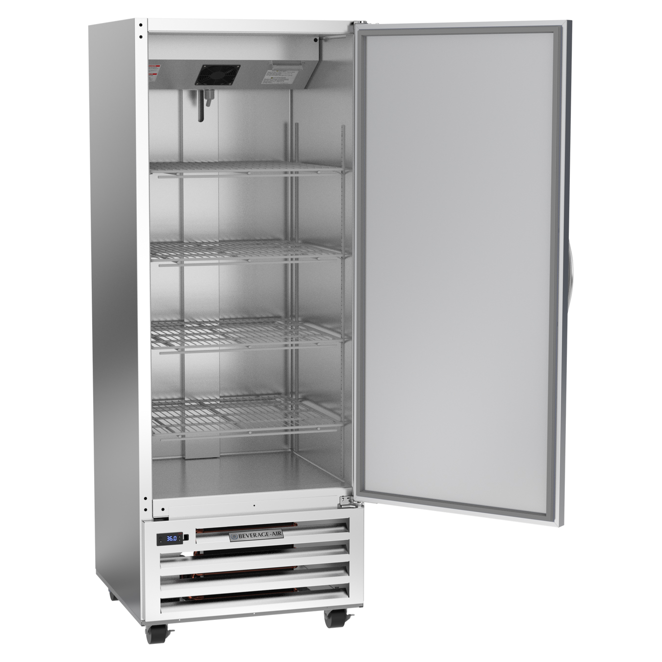 This 27" wide Beverage-Air RI18HC 16.85 Cu. Ft. Solid Reach-In Refrigerator features an all stainless steel exterior and interior. It has a bottom mounted compressor, and comes with 4 heavy duty epoxy coated wire shelves.
