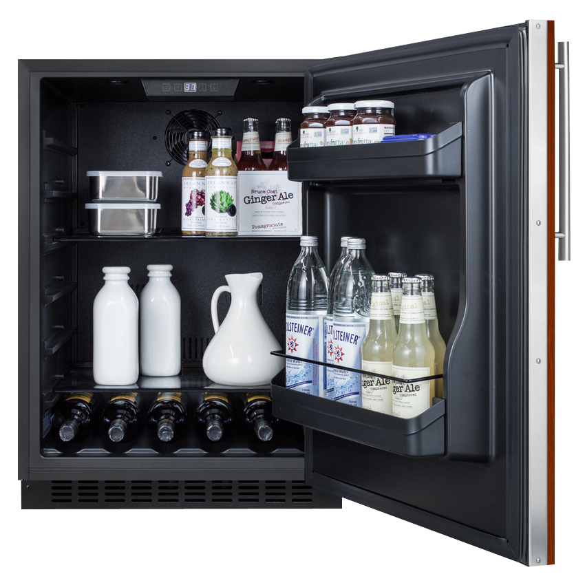 Sized with a convenient 24" footprint, Summit's AL54IF Built-In Undercounter All-Refrigerator is just 32" high to fit under lower counters complying with ADA guidelines for accessibility. The fully finished black cabinet allows freestanding use, while the front-breathing system also allows this unit to be built-in with minimum clearance. The door features an integrated stainless steel frame designed to accept full panel overlays, allowing users to seamlessly blend the unit into their cabinet design. The panel size should be 28-3/16" tall by 23-5/16" wide and weight no more than 10 pounds. This unit has a flush back for easy cleaning and a right angle cord.