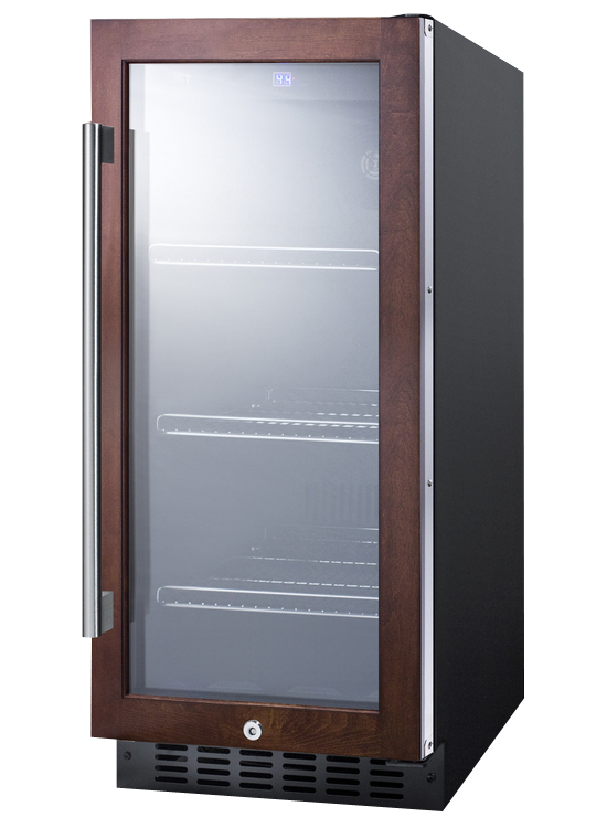 The Summit SCR1536BGPNR Beverage Center is a slim-fitting 14-3/4" wide beverage refrigerator that meets UL-471 standards and is ETL-S listed to NSF-7 for use in commercial settings but is also approved for residential use. The front-breathing design allows built-in installation under counters, while the fully finished black cabinet also allows you to use the unit freestanding. This model features a double pane tempered glass door with a panel-ready trim that lets you customize the look to best match adjacent cabinetry (panel dimensions: 14-9/16" W x 29-7/8" H at 3/4" minimum thickness). This unit ships with a right hand door swing. A factory-installed lock offers convenient security as needed. Users provide their own door panel and handle.