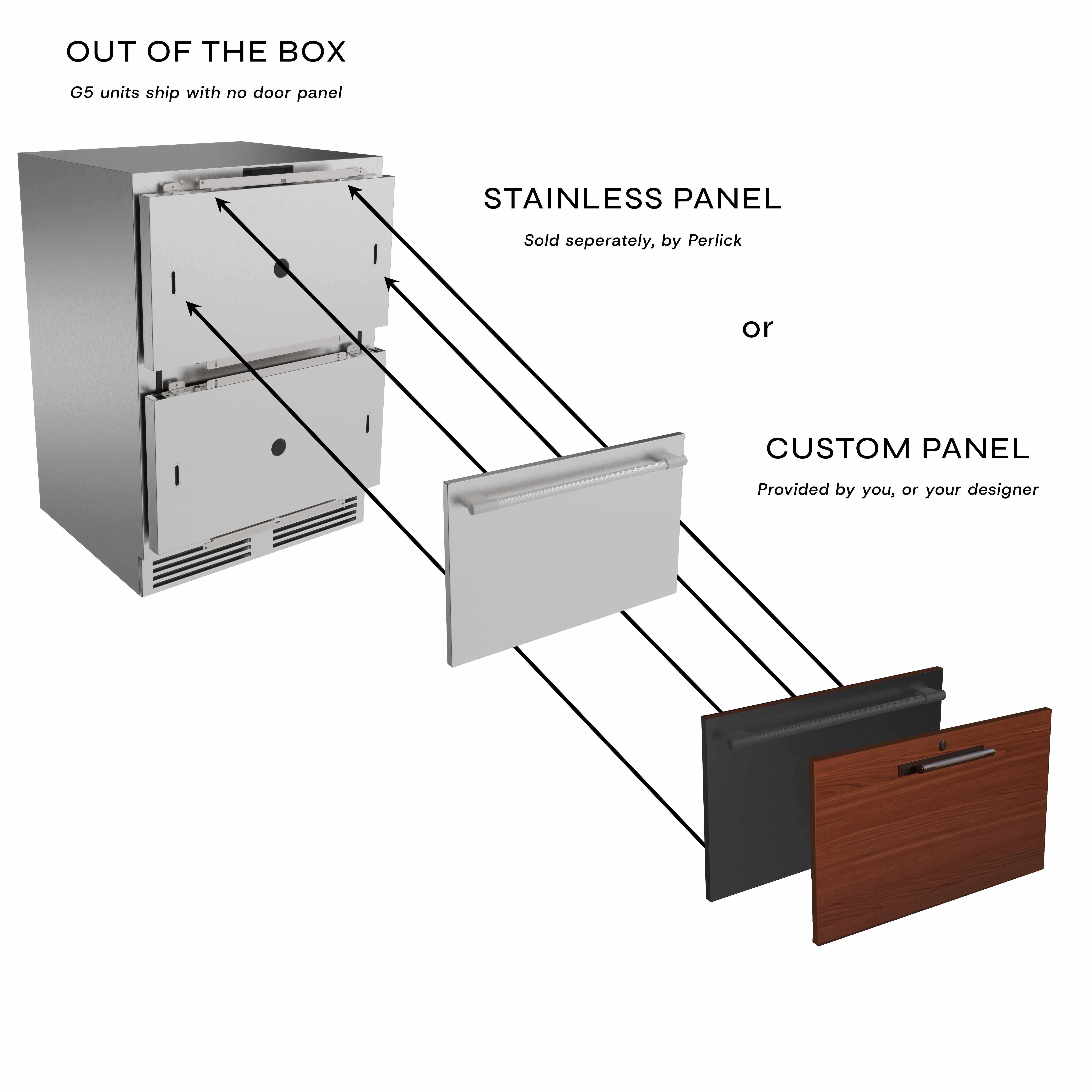 - Accommodates either custom millwork panels or Perlick stainless-steel panels (SOLD SEPARATELY) for a seamless built-in look