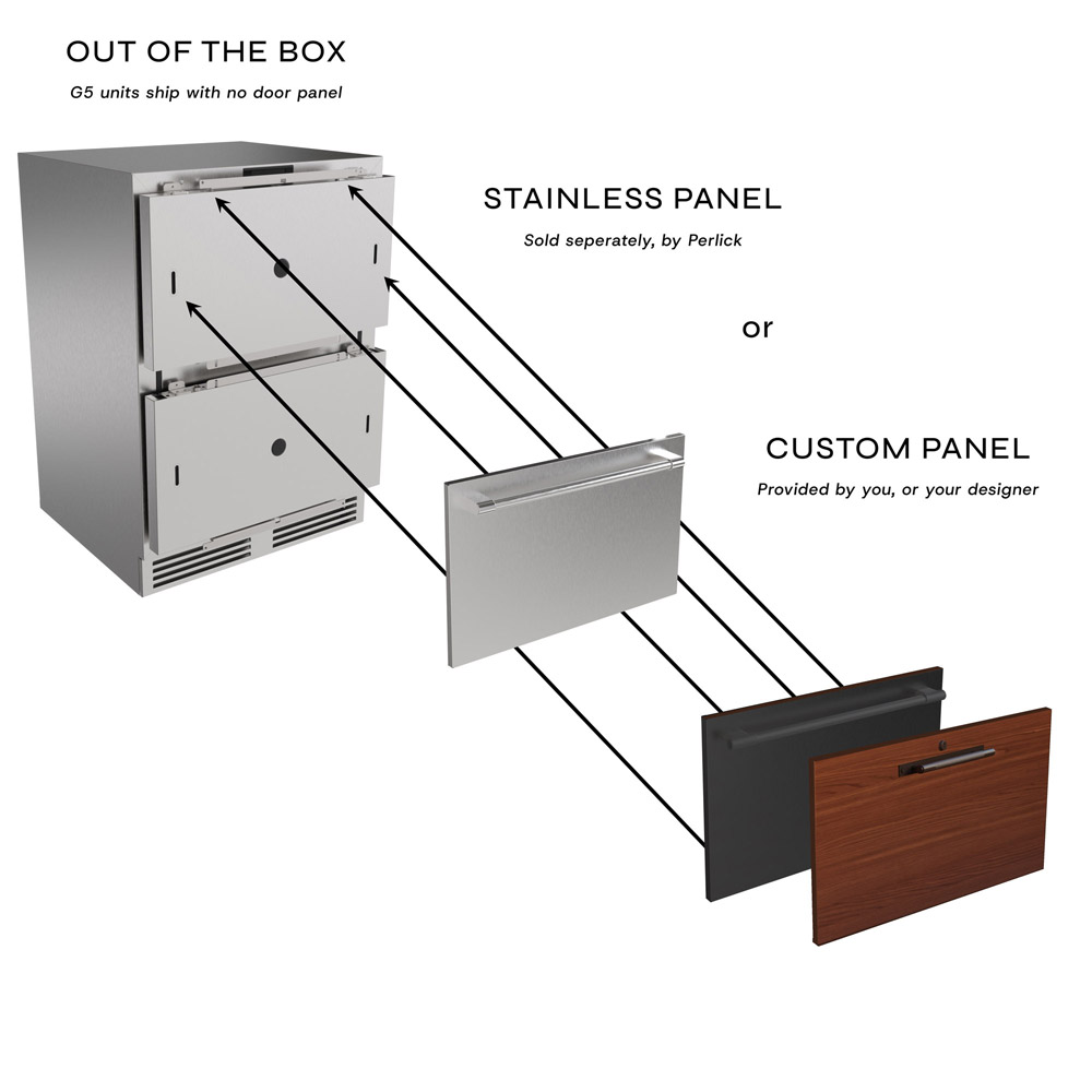 Crafted with over a century of premier commercial refrigeration expertise, the Perlick G5 collection brings the most innovative refrigeration available into the home - empowering hosts to serve effortlessly, whether for one guest or many. This Perlick G5RD24SC G5 24" Refrigerator Drawers comes panel-ready for full design customization, accommodating either custom millwork panels or Perlick stainless-steel panels (sold separately) for a seamless built-in look.