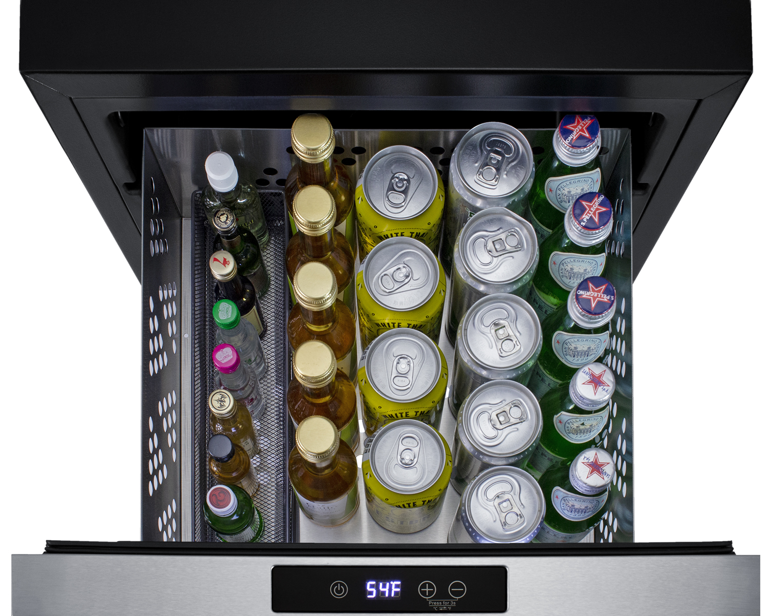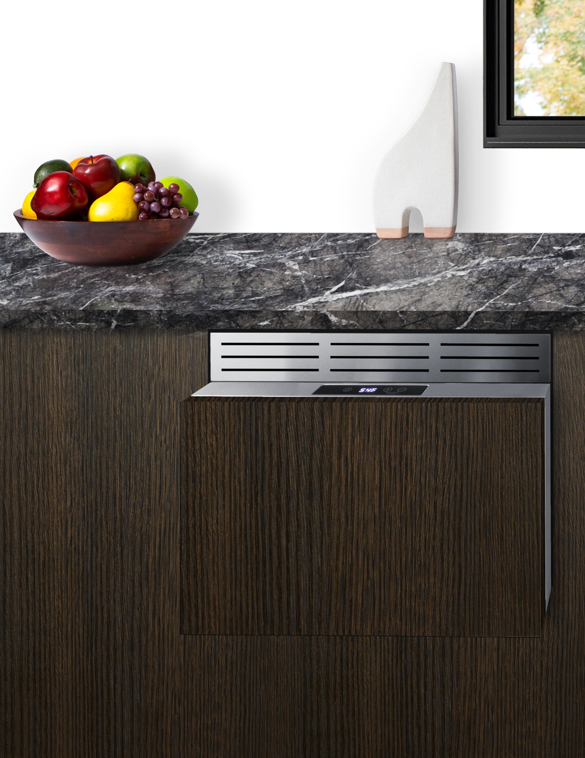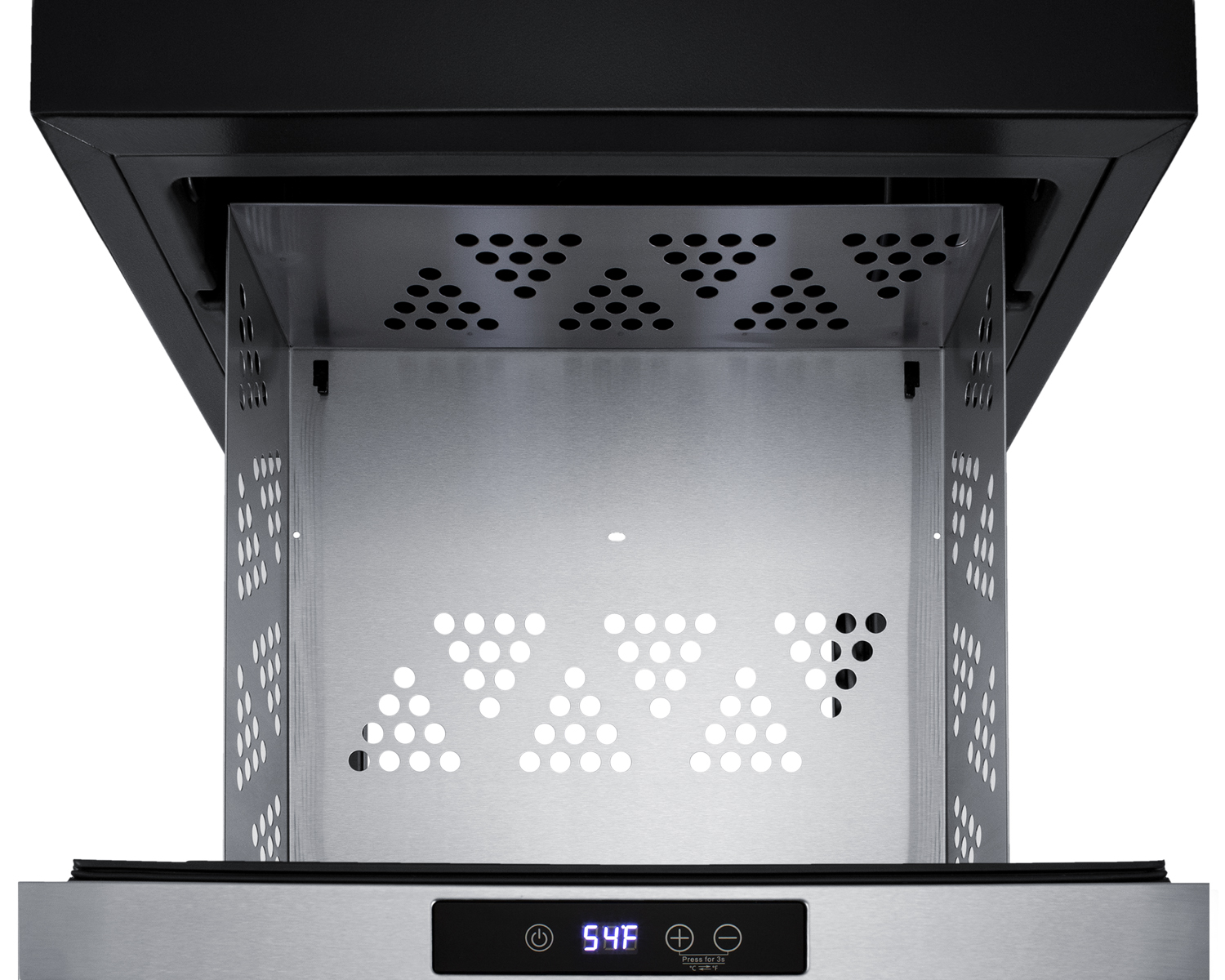 Summit's COOL1D is a 1-drawer wine and beverage chiller that utilizes an efficient and quiet solid state cooling system. The stainless steel drawer features a fully finished front with a horizontal grain to match any setting, with a pro-style handle included. The drawer front can also accept an overlay panel for a more customized look to blend or complement adjacent cabinetry (panel size: 17.87" W x 11.9" H at a 3/4" thickness). This cooler is designed to be installed in cabinet openings sized at 12" H x 18" W x 22.5" D and requires a 5.11" x 2.36" ventilation channel above the cabinet in the rear for proper operation. Alternatively, it includes a stainless steel front grill that raises the height an additional 2" to account for the exhaust.